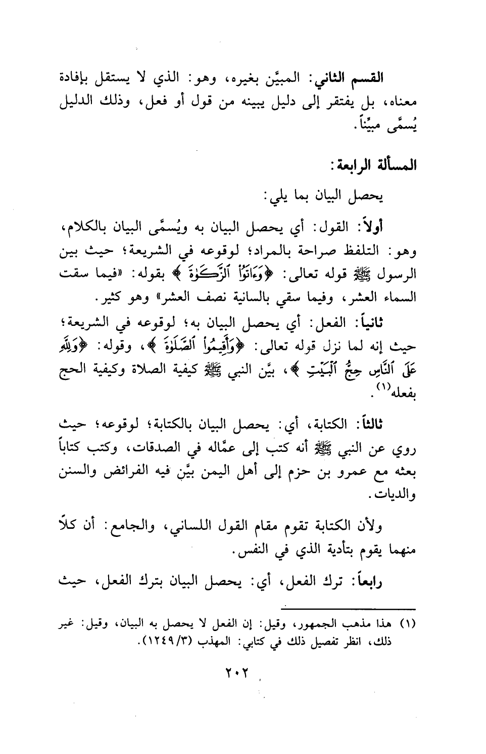 ثانياً: الفعل: أي يحصل البيان به؛ لوقوعه في الشريعة؛ حيث إنه لما نزل قوله تعالى: (وَأَقِيمُوا الصَّلَاةَ)، وقوله: (وَلِلَّهِ عَلَى النَّاسِ حِجُّ الْبَيْتِ)، بين النبي - صلى الله عليه وسلم - كيفية الصلاة وكيفية الحج بفعله.