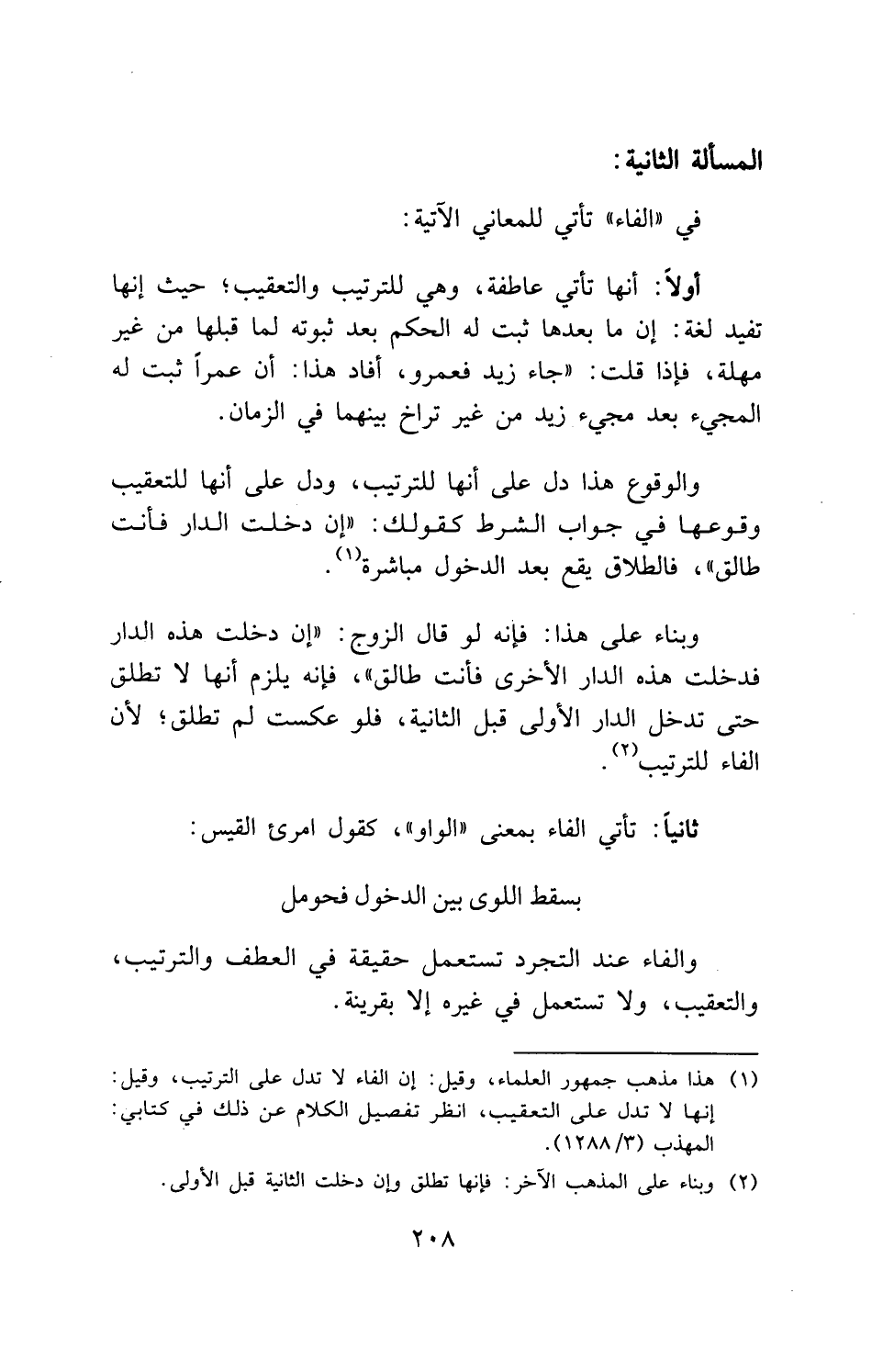 وبناء على هذا: فإنه لو قال الزوج: " إن دخلت هذه الدار فدخلت هذه الدار الأخرى فأنت طالق "، فإنه يلزم أنها لا تطلق حتى تدخل الدار الأولى قبل الثانية، فلو عكست لم تطلق؛ لأن الفاء للترتيب.