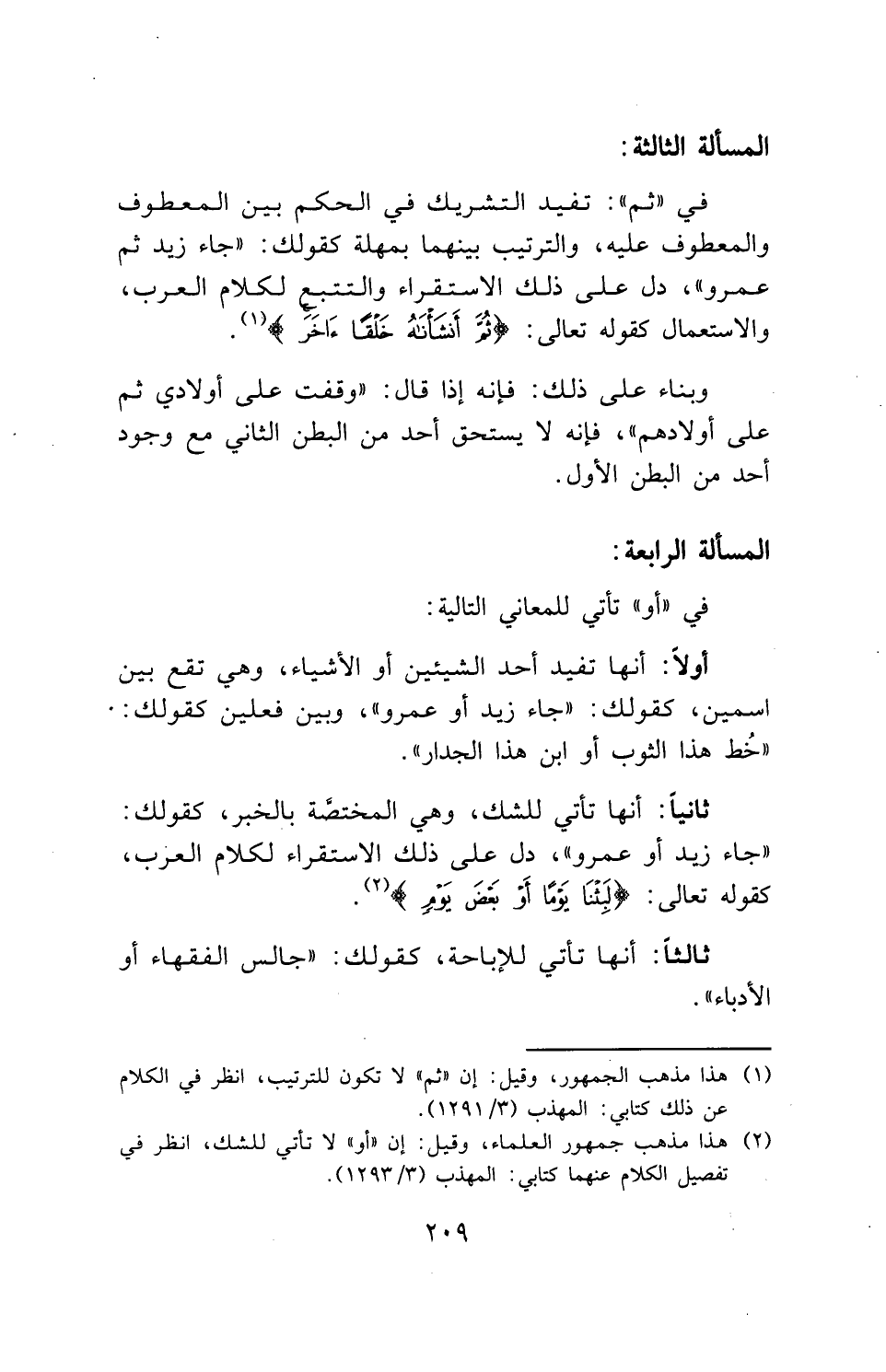 في " ثم ": تفيد التشريك في الحكم بين المعطوف والمعطوف عليه، والترتيب بينهما بمهلة كقولك: " جاء زيد ثم عمرو "، دل على ذلك الاستقراء والتتبع لكلام العرب، والاستعمال كقوله تعالى: (ثُمَّ أَنْشَأْنَاهُ خَلْقًا آخَرَ).