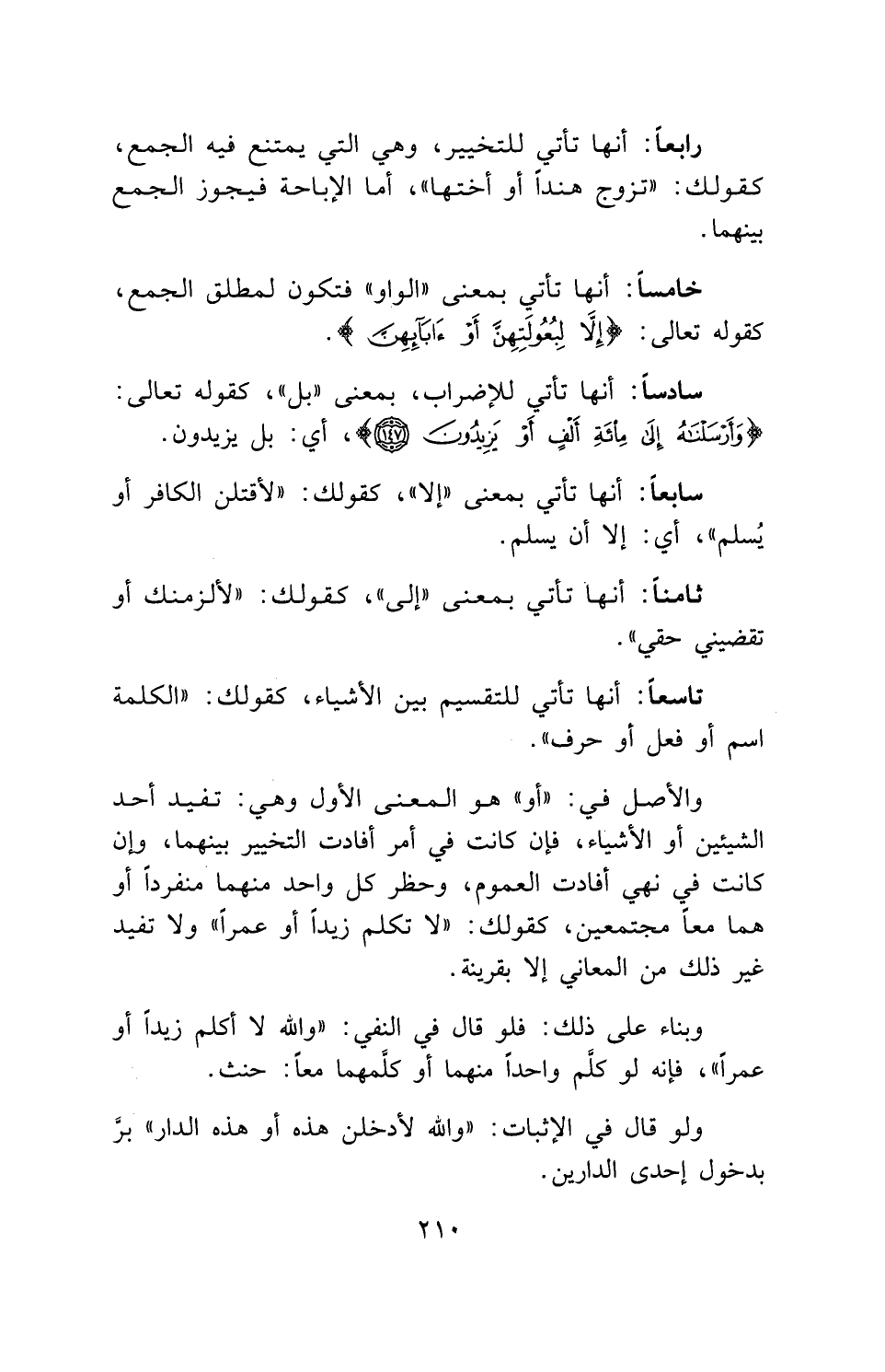 والأصل في: " أو " هو المعنى الأول وهي: تفيد أحد الشيئين أو الأشياء، فإن كانت في أمر أفادت التخيير بينهما، وإن كانت في نهي أفادت العموم، وحظر كل واحد منهما منفرداً أو هما معاً مجتمعين، كقولك: " لا تكلم زيداً أو عمراً " ولا تفيد غير ذلك من المعاني إلا بقرينة.