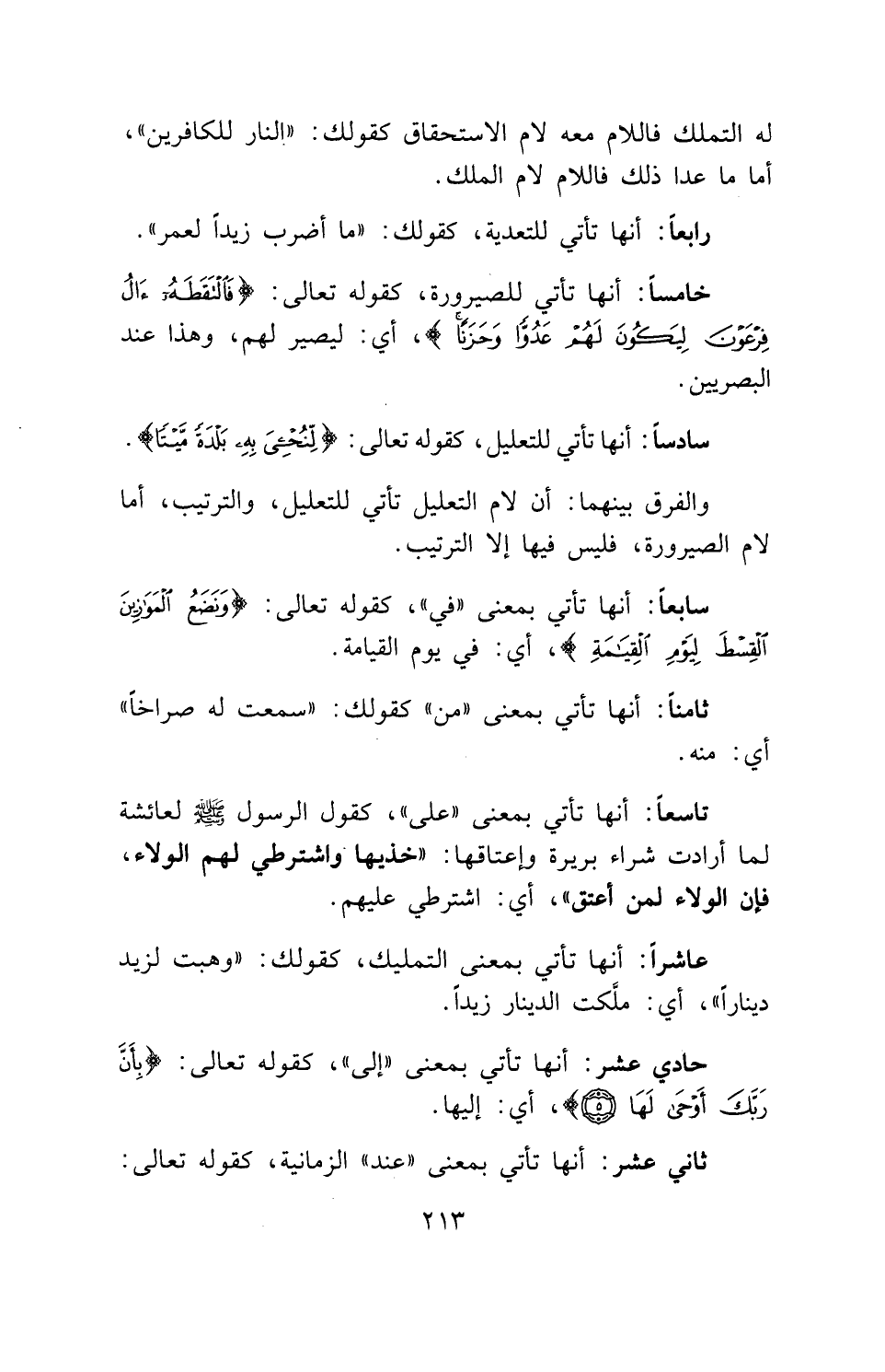 تاسعاً: أنها تأتي بمعنى " على "، كقول الرسول - صلى الله عليه وسلم - لعائشة لما أرادت شراء بريرة وإعتاقها: " خذيها واشترطي لهم الولاء، فإن الولاء لمن أعتق "، أي: اشترطي عليهم.
