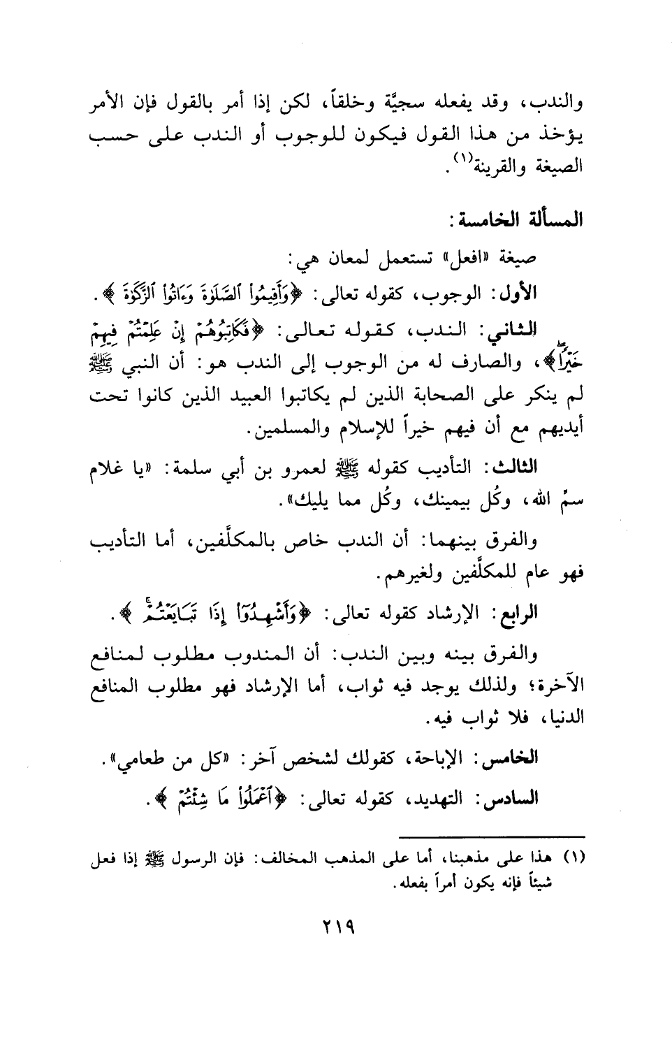 الثاني: الندب، كقوله تعالى: (فَكَاتِبُوهُمْ إِنْ عَلِمْتُمْ فِيهِمْ خَيْرًا)، والصارف له من الوجوب إلى الندب هو: أن النبي - صلى الله عليه وسلم - لم ينكر على الصحابة الذين لم يكاتبوا العبيد الذين كانوا تحت أيديهم مع أن فيهم خيراً للإسلام والمسلمين.