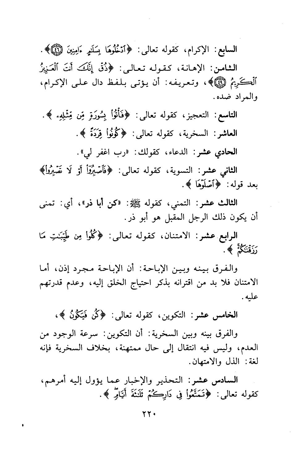 الخامس عشر: التكوين، كقوله تعالى: (كُنْ فَيَكُونُ)، والفرق بينه وبين السخرية: أن التكوين: سرعة الوجود من العدم، وليس فيه انتقال إلى حال ممتهنة، بخلاف السخرية فإنه لغة: الذل والامتهان.
