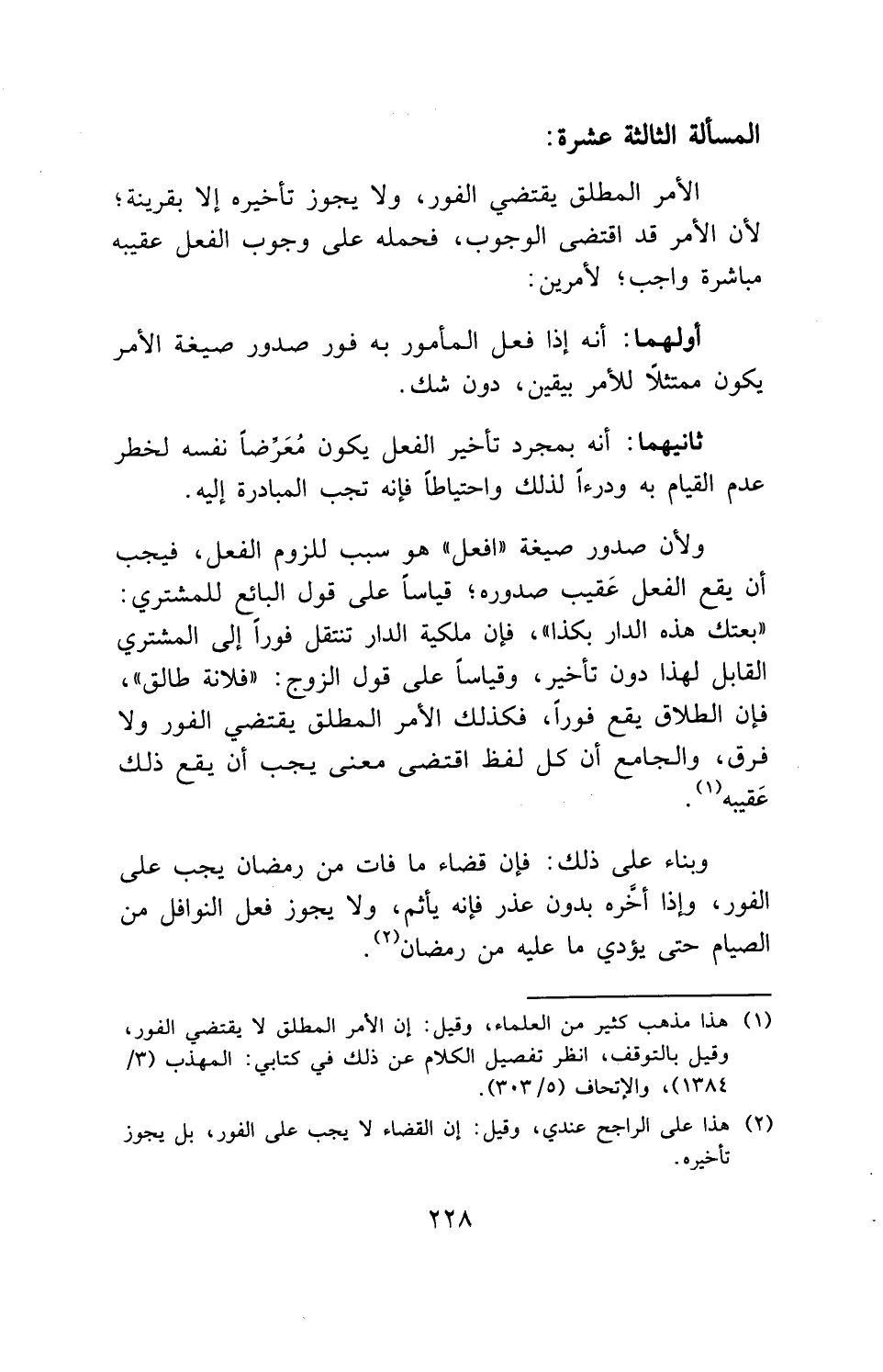 ولأن صدور صيغة " افعل " هو سبب للزوم الفعل، فيجب أن يقع الفعل عَقيب صدوره؛ قياساً على قول البائع للمشتري: " بعتك هذه الدار بكذا "، فإن ملكية الدار تنتقل فوراً إلى المشتري القابل لهذا دون تأخير، وقياساً على قول الزوج: " فلانة طالق "، فإن الطلاق يقع فوراً، فكذلك الأمر المطلق يقتضي الفور ولا فرق، والجامع أن كل لفظ اقتضى معنى يجب أن يقع ذلك عَقيبه.
