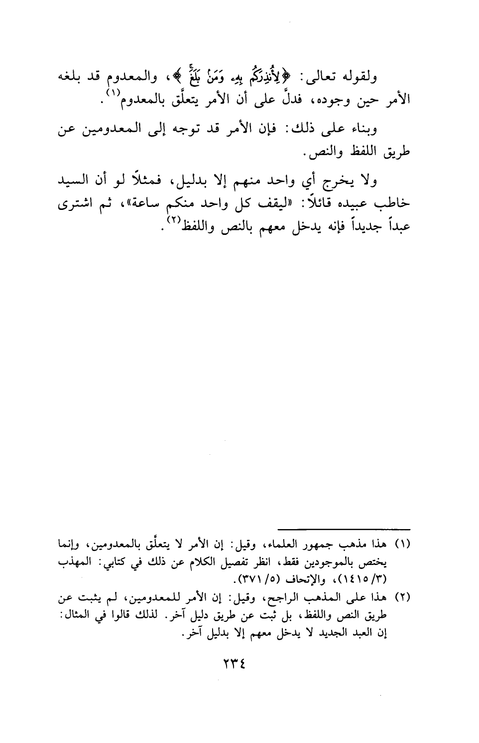 ولقوله تعالى: (لِأُنْذِرَكُمْ بِهِ وَمَنْ بَلَغَ)، والمعدوم قد بلغه الأمر حين وجوده، فدلَّ على أن الأمر يتعلق بالمعدوم.