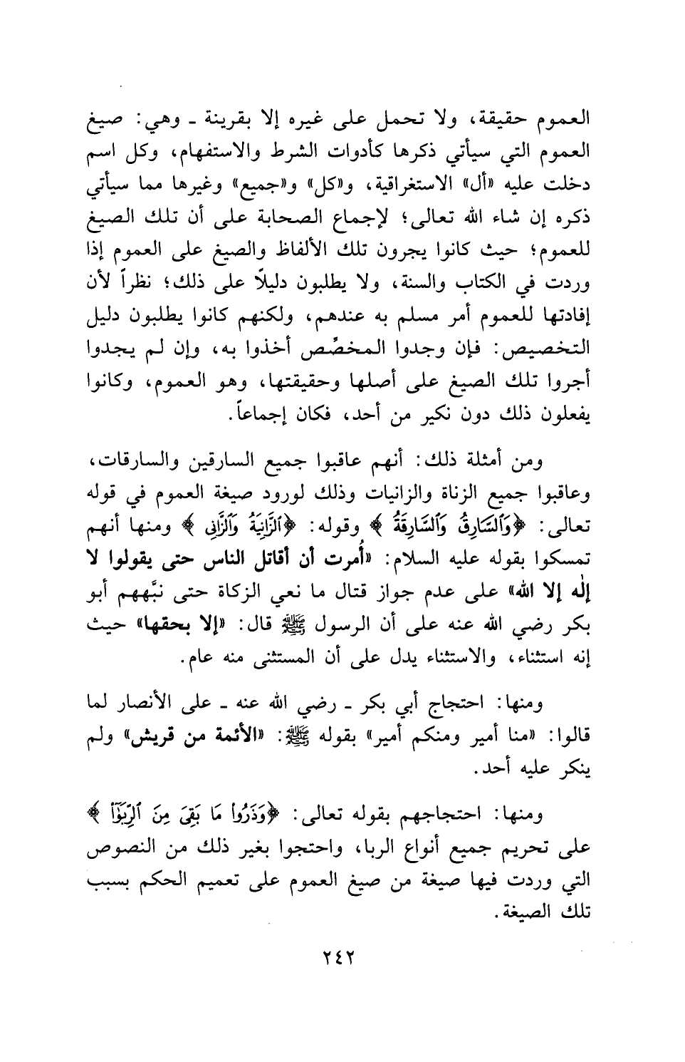 ومنها: احتجاجهم بقوله تعالى: (وَذَرُوا مَا بَقِيَ مِنَ الرِّبَا) على تحريم جميع أنواع الربا، واحتجوا بغير ذلك من النصوص التي وردت فيها صيغة من صيغ العموم على تعميم الحكم بسبب تلك الصيغة.