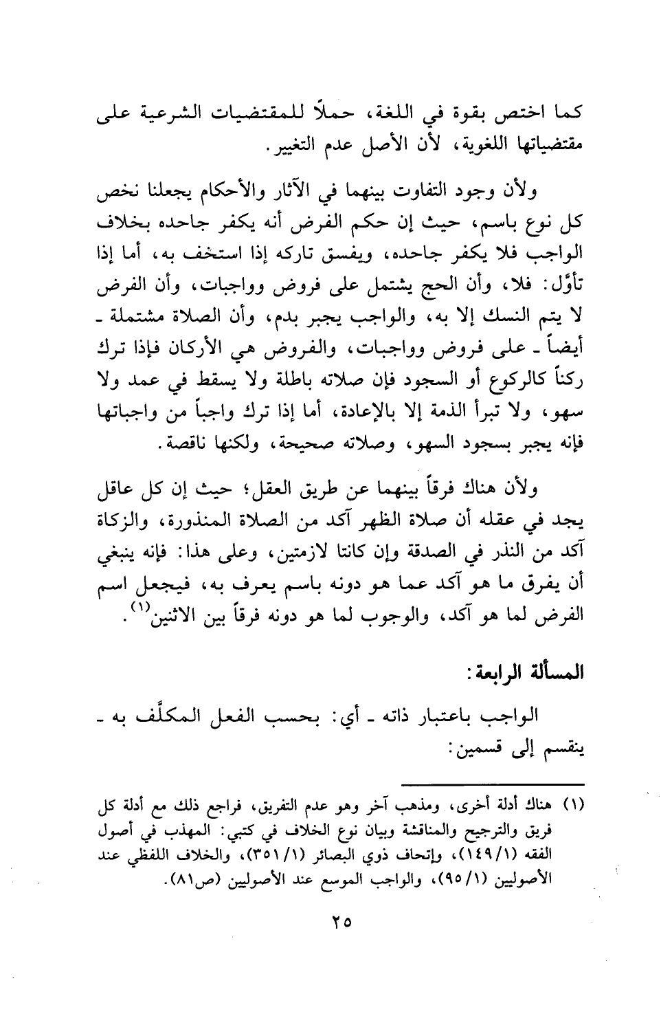 ولأن وجود التفاوت بينهما في الآثار والأحكام يجعلنا نخص كل نوع باسم، حيث إن حكم الفرض أنه يكفر جاحده بخلاف الواجب فلا يكفر جاحده، ويفسق تاركه إذا استخف به، أما إذا تأول: فلا، وأن الحج يشتمل على فروض وواجبات، وأن الفرض لا يتم النسك إلا به، والواجب يجبر بدم، وأن الصلاة مشتملة - أيضاً - على فروض وواجبات، والفروض هي الأركان فإذا ترك ركناً كالركوع أو السجود فإن صلاته باطلة ولا يسقط في عمد ولا سهو، ولا تبرأ الذمة إلا بالإعادة، أما إذا ترك واجباً من واجباتها فإنه يجبر بسجود السهو، وصلاته صحيحة، ولكنها ناقصة.