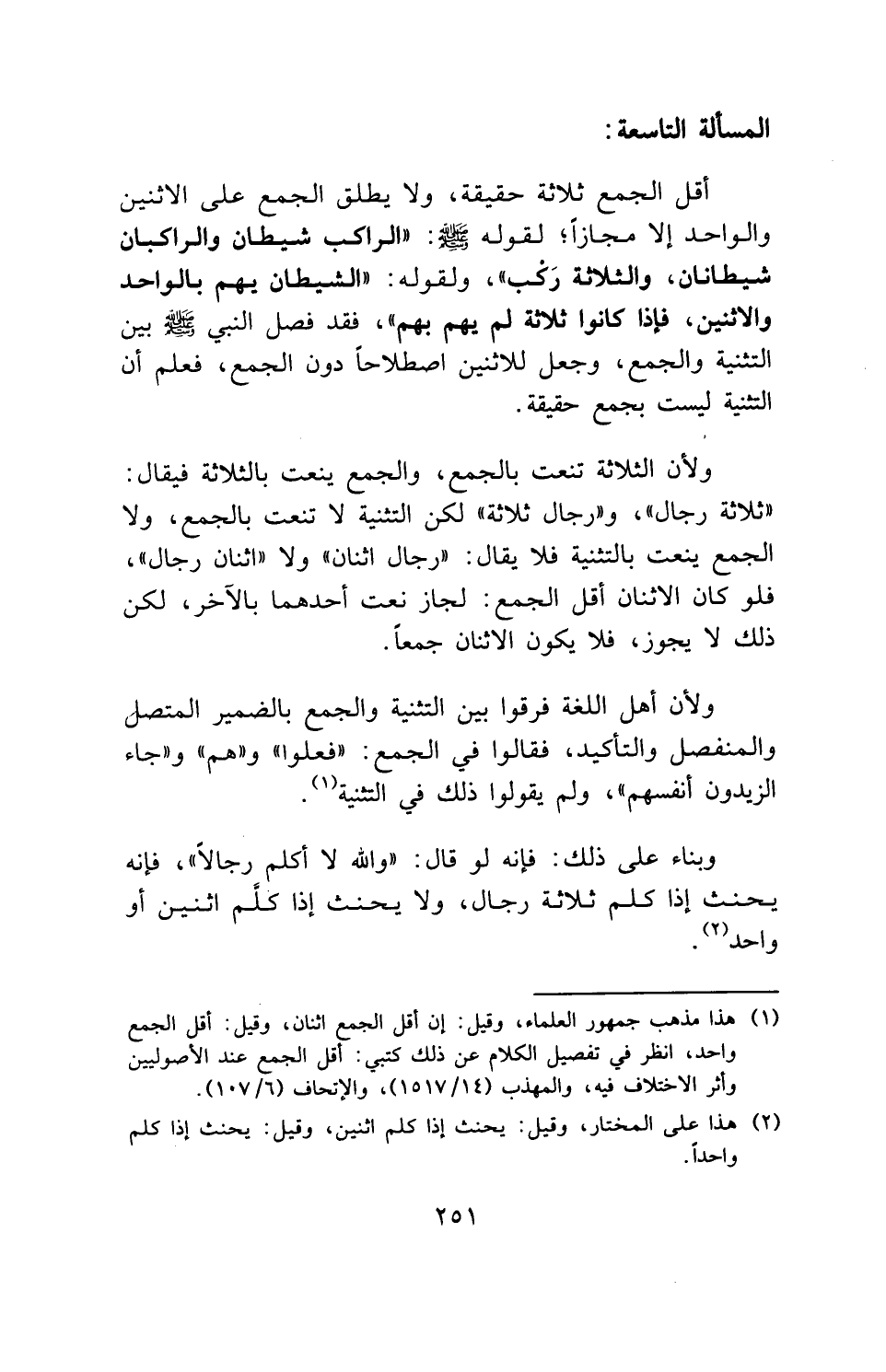 أقل الجمع ثلاثة حقيقة، ولا يطلق الجمع على الاثنين والواحد إلا مجازاً؛ لقوله - صلى الله عليه وسلم -: " الراكب شيطان والراكبان شيطانان، والثلاثة رَكب "، ولقوله: " الشيطان يهم بالواحد والاثنين، فإذا كانوا ثلاثة لم يهم بهم "،، فقد فصل النبي - صلى الله عليه وسلم - بين التثنية والجمع، وجعل للاثنين اصطلاحاً دون الجمع، فعلم أن التثنية ليست بجمع حقيقة.