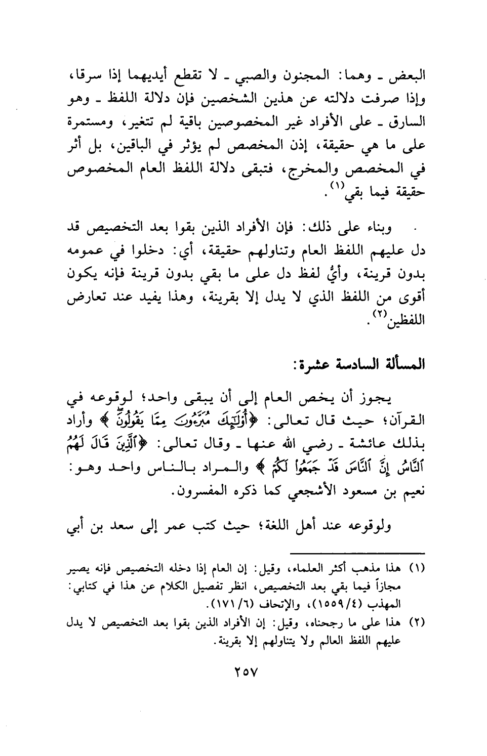 يجوز أن يخص العام إلى أن يبقى واحد؛ لوقوعه في القرآن؛ حيث قال تعالى: (أُولَئِكَ مُبَرَّءُونَ مِمَّا يَقُولُونَ) وأراد بذلك عائشة - رضي الله عنها - وقال تعالى: (الَّذِينَ قَالَ لَهُمُ النَّاسُ إِنَّ النَّاسَ قَدْ جَمَعُوا لَكُمْ) والمراد بالناس واحد وهو: نعيم بن مسعود الأشجعي كما ذكره المفسرون.