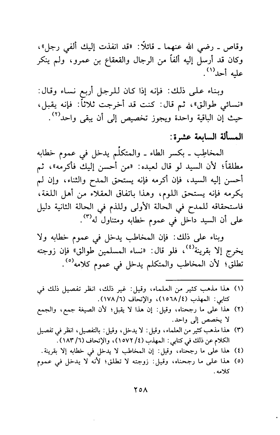 وبناء على ذلك: فإن المخاطب يدخل في عموم خطابه ولا يخرج إلا بقرينة، فلو قال: " نساء المسلمين طوالق " فإن زوجته تطلق، لأن المخاطب والمتكلم يدخل في عموم كلامه.