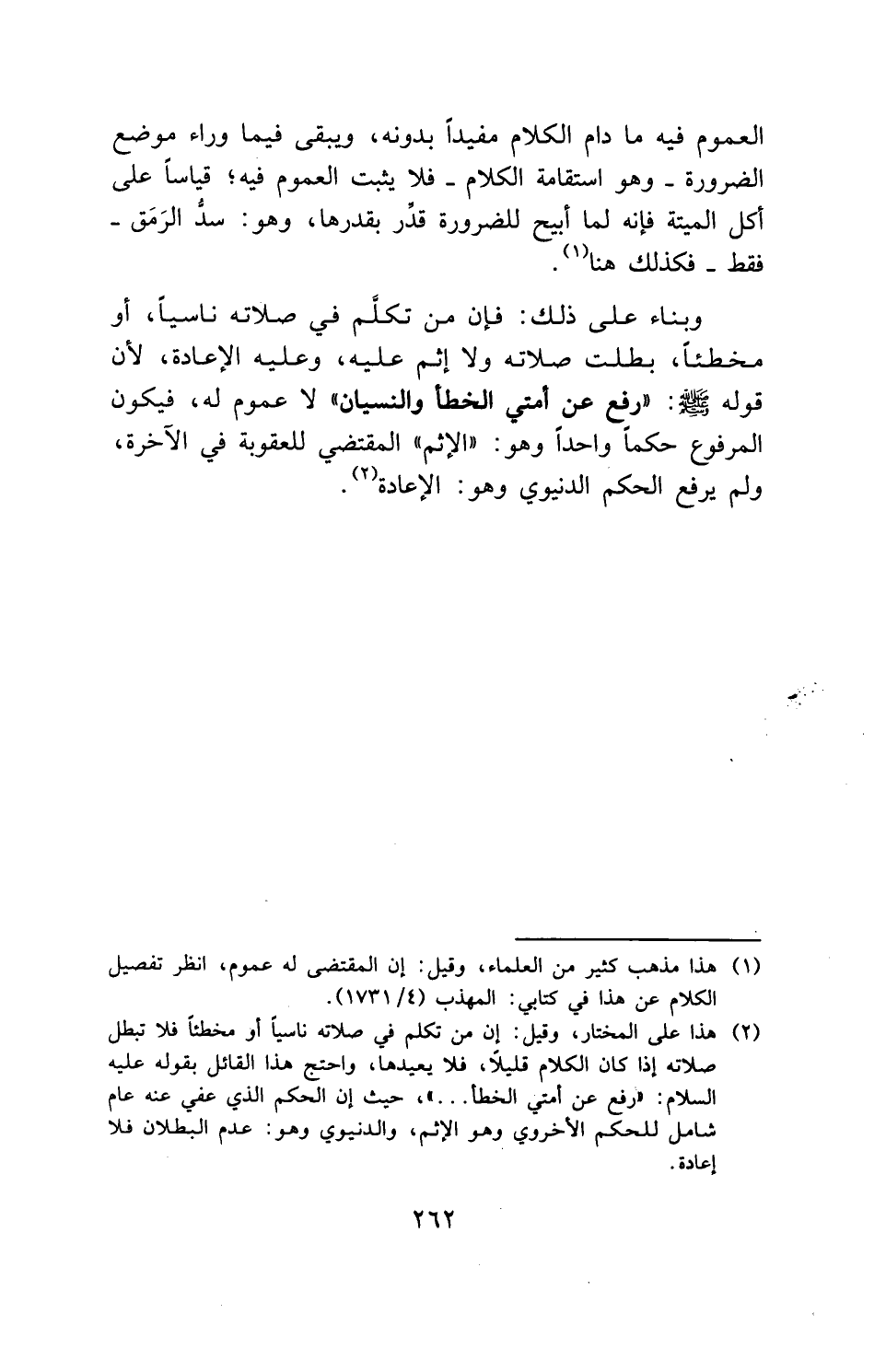 وبناء على ذلك: فإن من تكلَّم في صلاته ناسياً، أو مخطئاً، بطلت صلاته ولا إثم عليه، وعليه الإعادة، لأن قوله - صلى الله عليه وسلم -: " رفع عن أمتي الخطأ والنسيان " لا عموم له، فيكون المرفوع حكماً واحداً وهو: " الإثم " المقتضي للعقوبة في الآخرة، ولم يرفع الحكم الدنيوي وهو: الإعادة.