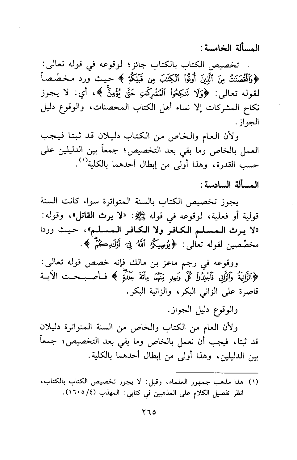 ولأن العام والخاص من الكتاب دليلان قد ثبتا فيجب العمل بالخاص وما بقي بعد التخصيص؛ جمعاً بين الدليلين على حسب القدرة، وهذا أولى من إبطال أحدهما بالكلية.