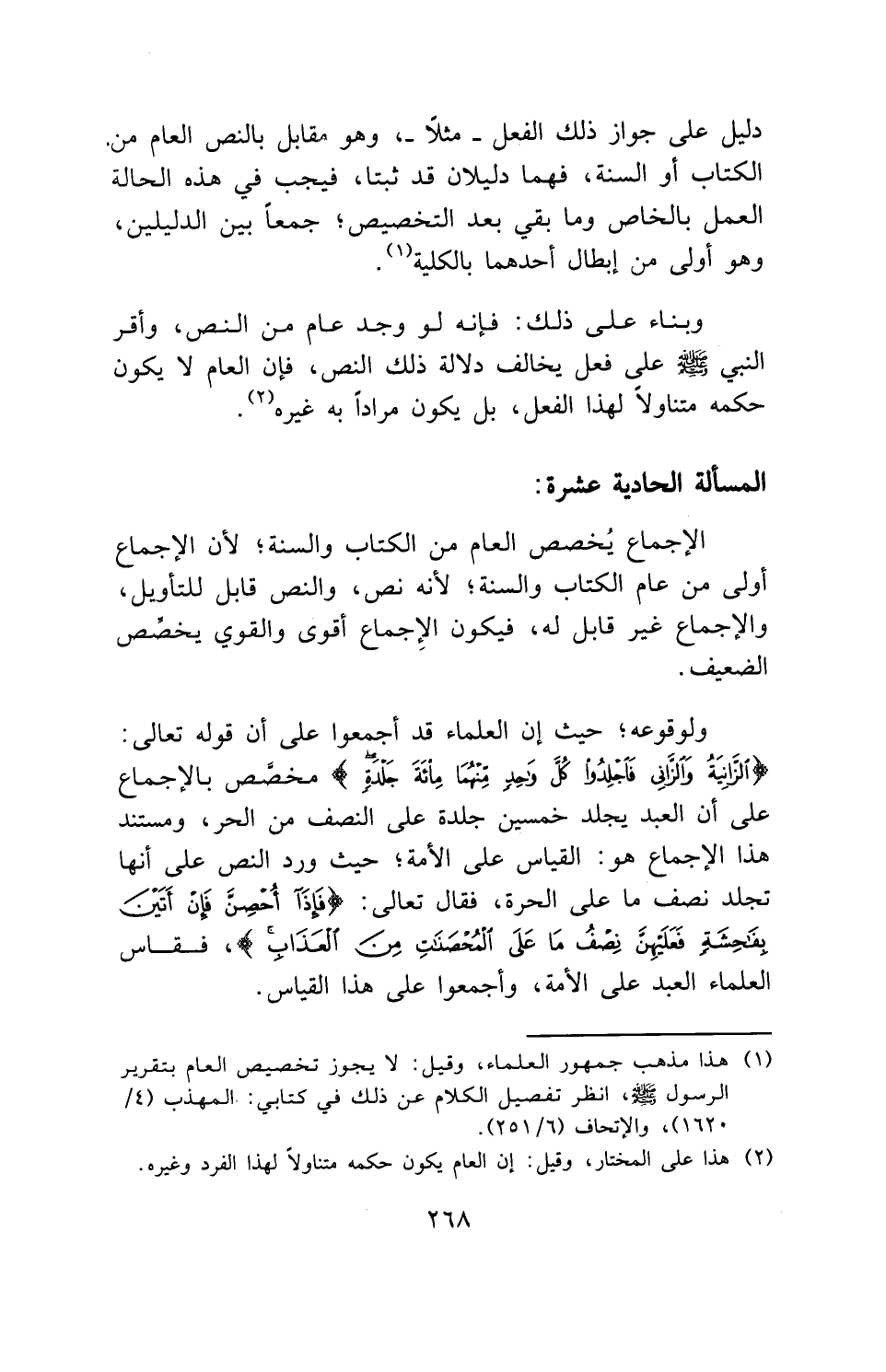 ولوقوعه؛ حيث إن العلماء قد أجمعوا على أن قوله تعالى: (الزَّانِيَةُ وَالزَّانِي فَاجْلِدُوا كُلَّ وَاحِدٍ مِنْهُمَا مِائَةَ جَلْدَةٍ) مخصص بالإجماع على أن العبد يجلد خمسين جلدة على النصف من الحر، ومستند هذا الإجماع هو: القياس على الأمة؛ حيث ورد النص على أنها تجلد نصف ما على الحرة، فقال تعالى: (فَإِذَا أُحْصِنَّ فَإِنْ أَتَيْنَ بِفَاحِشَةٍ فَعَلَيْهِنَّ نِصْفُ مَا عَلَى الْمُحْصَنَاتِ مِنَ الْعَذَابِ)، فقاس العلماء العبد على الأمة، وأجمعوا على هذا القياس.