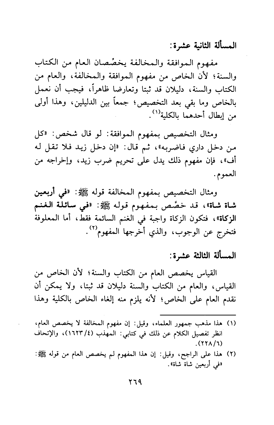 مفهوم الموافقة والمخالفة يخصصان العام من الكتاب والسنة؛ لأن الخاص من مفهوم الموافقة والمخالفة، والعام من الكتاب والسنة، دليلان قد ثبتا وتعارضا ظاهراً، فيجب أن نعمل بالخاص وما بقي بعد التخصيص؛ جمعاً بين الدليلين، وهذا أولى من إبطال أحدهما بالكلية.