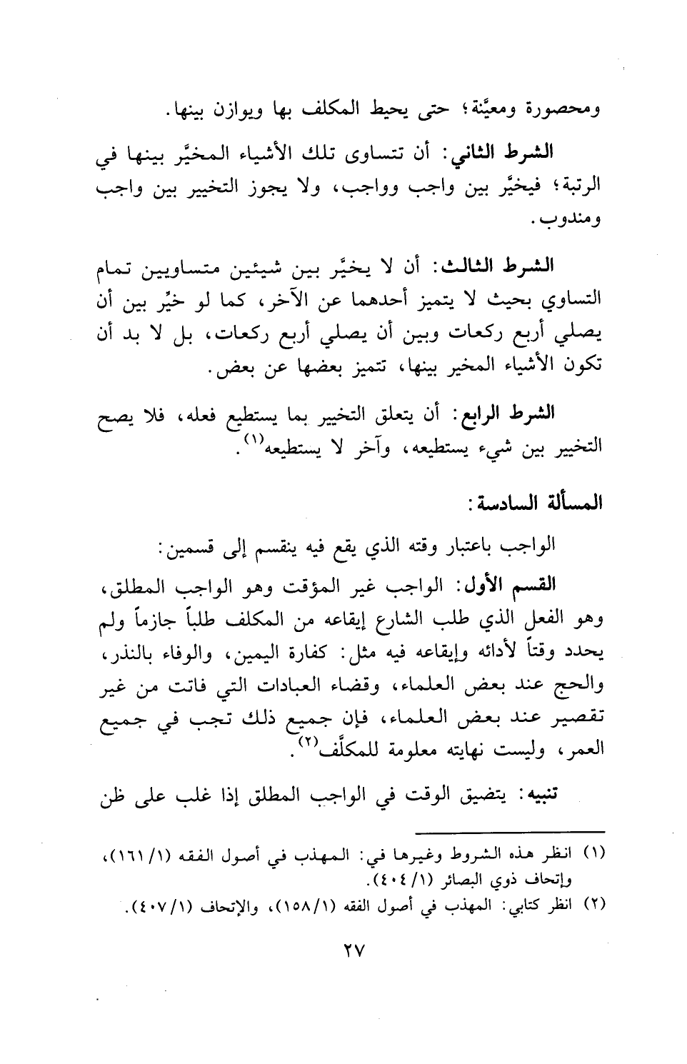 ْالشرط الثالث: أن لا يخيَّر بين شيئين متساويين تمام التساوي بحيث لا يتميز أحدهما عن الآخر، كما لو خير بين أن يصلي أربع ركعات وبين أن يصلي أربع ركعات، بل لا بد أن تكون الأشياء المخير بينها، تتميز بعضها عن بعض.