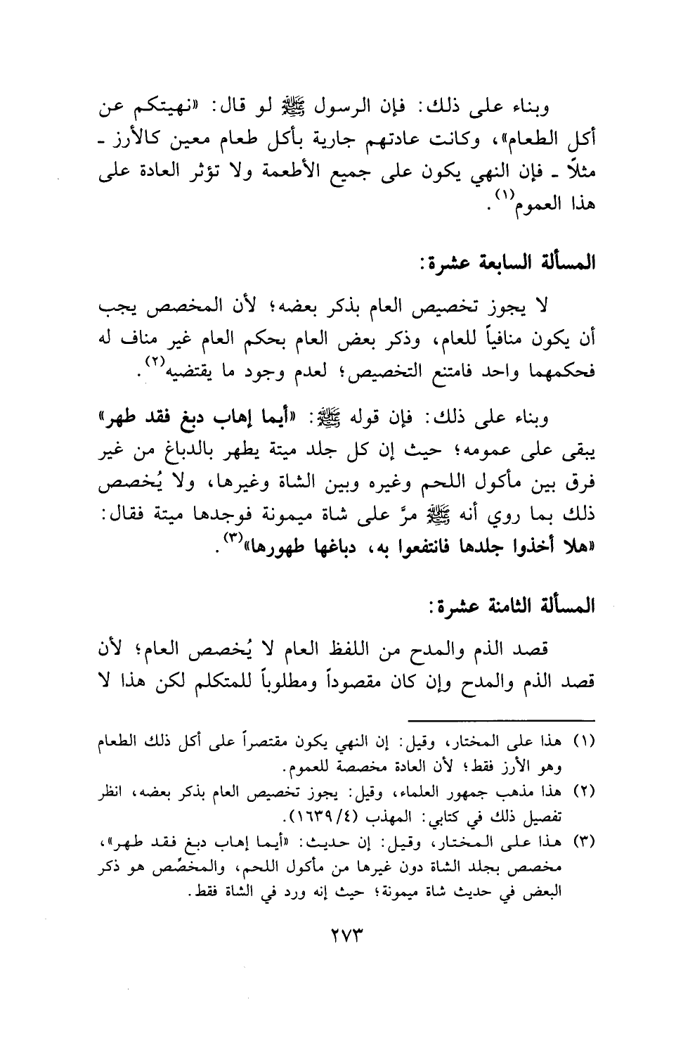 وبناء على ذلك: فإن قوله - صلى الله عليه وسلم -: " أيما إهاب دبغ فقد طهر " يبقى على عمومه؛ حيث إن كل جلد ميتة يطهر بالدباغ من غير فرق بين مأكول اللحم وغيره وبين الشاة وغيرها، ولا يُخصص ذلك بما روي أنه - صلى الله عليه وسلم - مرَّ على شاة ميمونة فوجدها ميتة فقال: " هلا أخذوا جلدها فانتفعوا به، دباغها طهورها ".