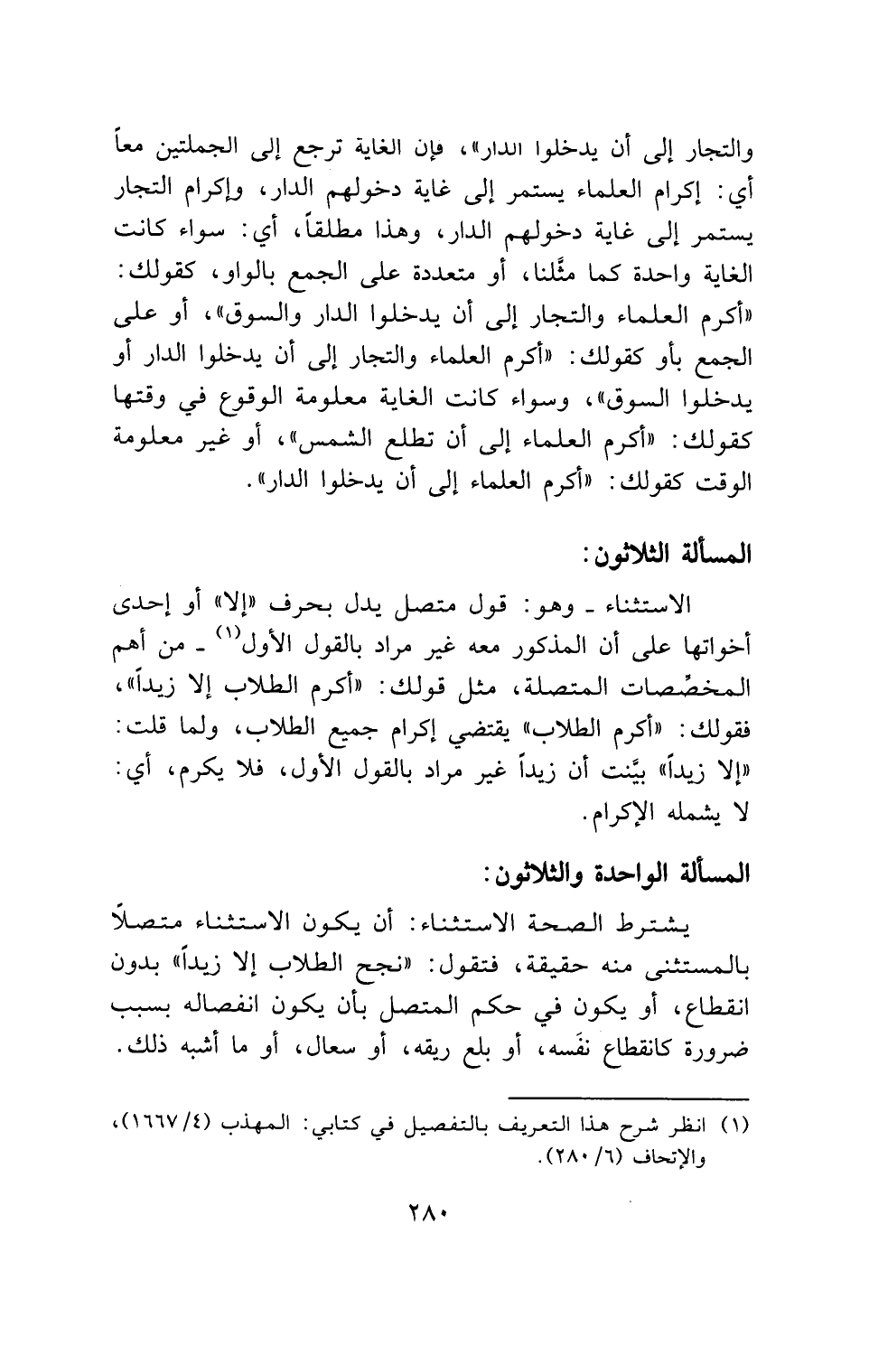 يشترط الصحة الاستثناء: أن يكون الاستثناء متصلاً بالمستثنى منه حقيقة، فتقول: " نجح الطلاب إلا زيداً " بدون انقطاع، أو يكون في حكم المتصل بأن يكون انفصاله بسبب ضرورة كانقطاع نفَسه، أو بلع ريقه، أو سعال، أو ما أشبه ذلك.