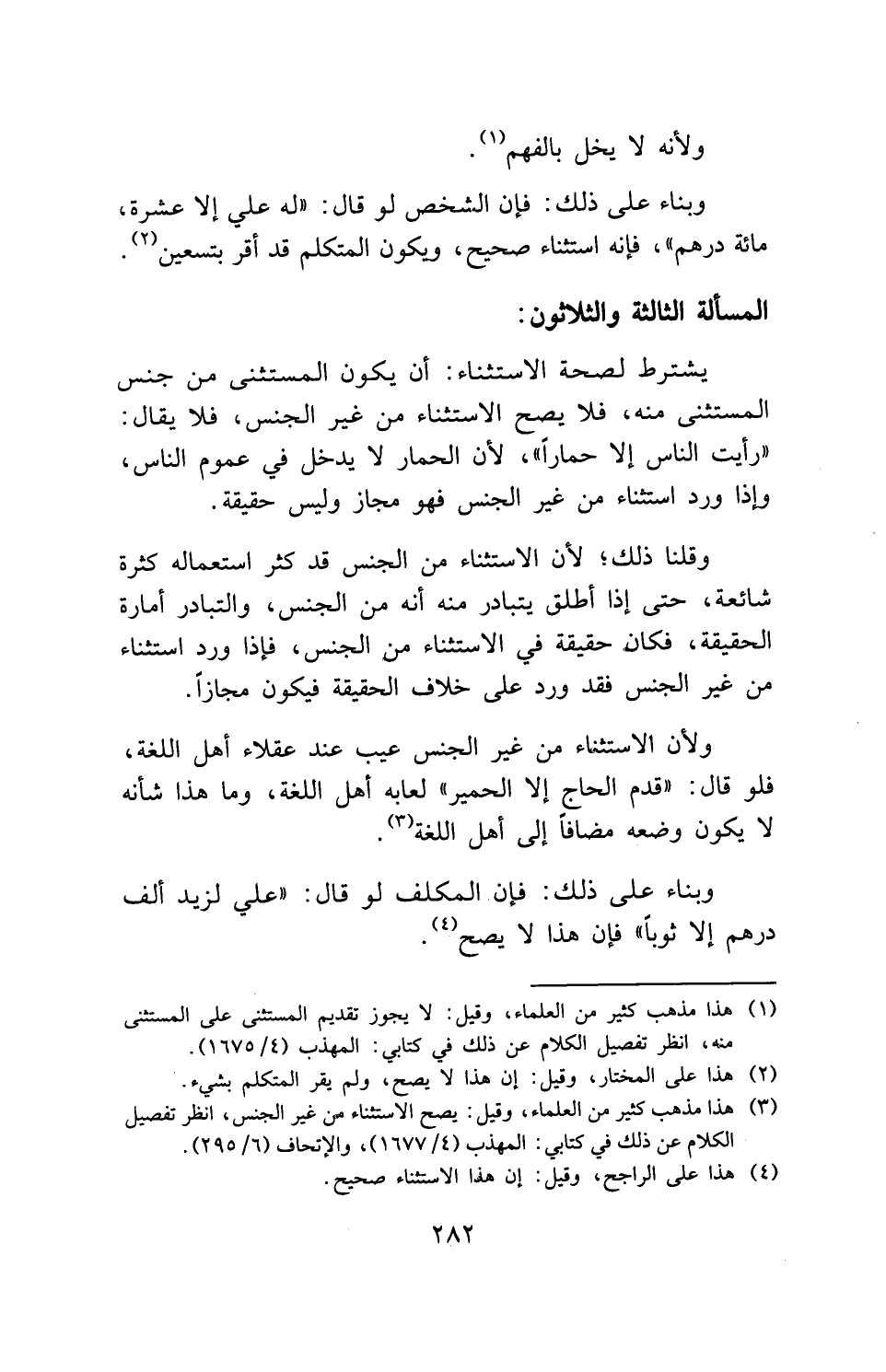 يشترط لصحة الاستثناء: أن يكون المستثنى من جنس المستثنى منه، فلا يصح الاستثناء من غير الجنس، فلا يقال: " رأيت الناس إلا حمارا "، لأن الحمار لا يدخل في عموم الناس، وإذا ورد استثناء من غير الجنس فهو مجاز وليس حقيقة.