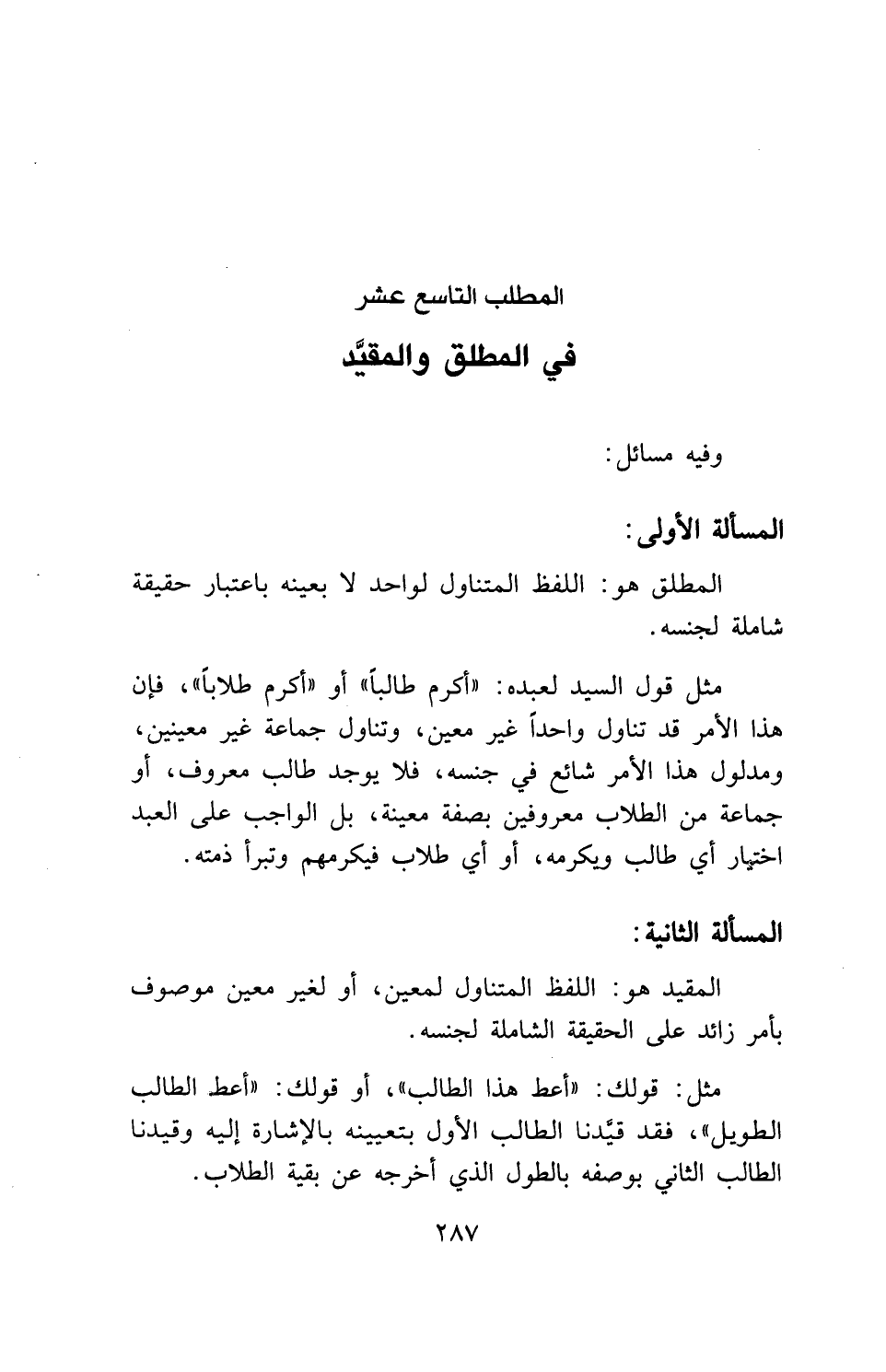 مثل: قولك: " أعط هذا الطالب "، أو قولك: " أعط الطالب الطويل "، فقد قيدنا الطالب الأول بتعيينه بالإشارة إليه وقيدنا الطالب الثاني بوصفه بالطول الذي أخرجه عن بقية الطلاب.