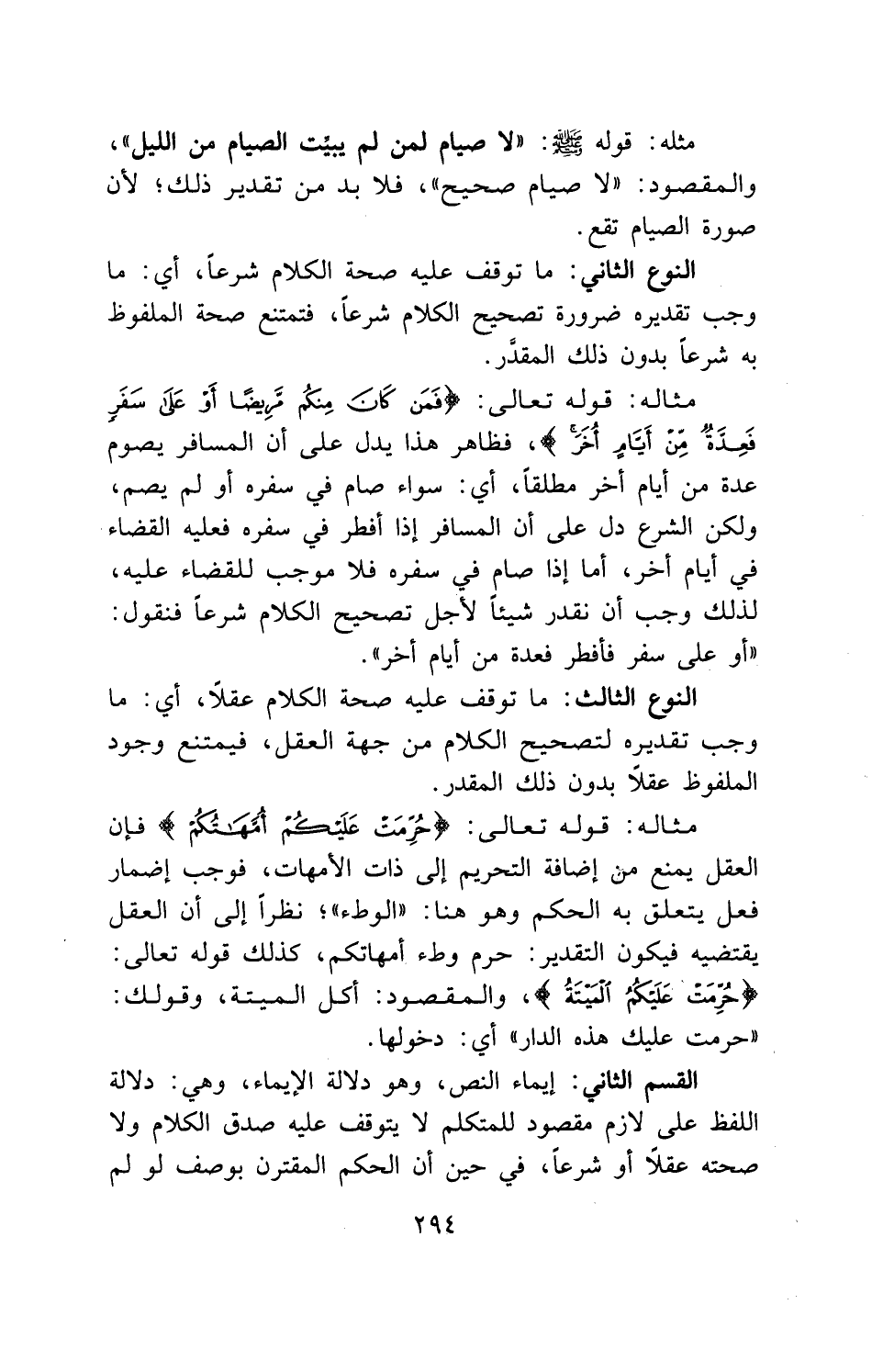 النوع الثاني: ما توقف عليه صحة الكلام شرعاً، أي: ما وجب تقديره ضرورة تصحيح الكلام شرعاً، فتمتنع صحة الملفوظ به شرعاً بدون ذلك المقدَّر.