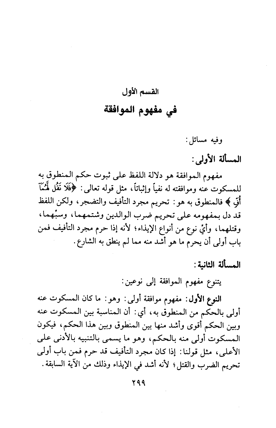 النوع الأول: مفهوم موافقة أولى: وهو: ما كان المسكوت عنه أولى بالحكم من المنطوق به، أي: أن المناسبة بين المسكوت عنه وبين الحكم أقوى وأشد منها بين المنطوق وبين هذا الحكم، فيكون المسكوت أولى منه بالحكم، وهو ما يسمى بالتنبيه بالأدنى على الأعلى، مثل قولنا: إذا كان مجرد التأفيف قد حرم فمن باب أولى تحريم الضرب والقتل؛ لأنه أشد في الإيذاء وذلك من الآية السابقة.