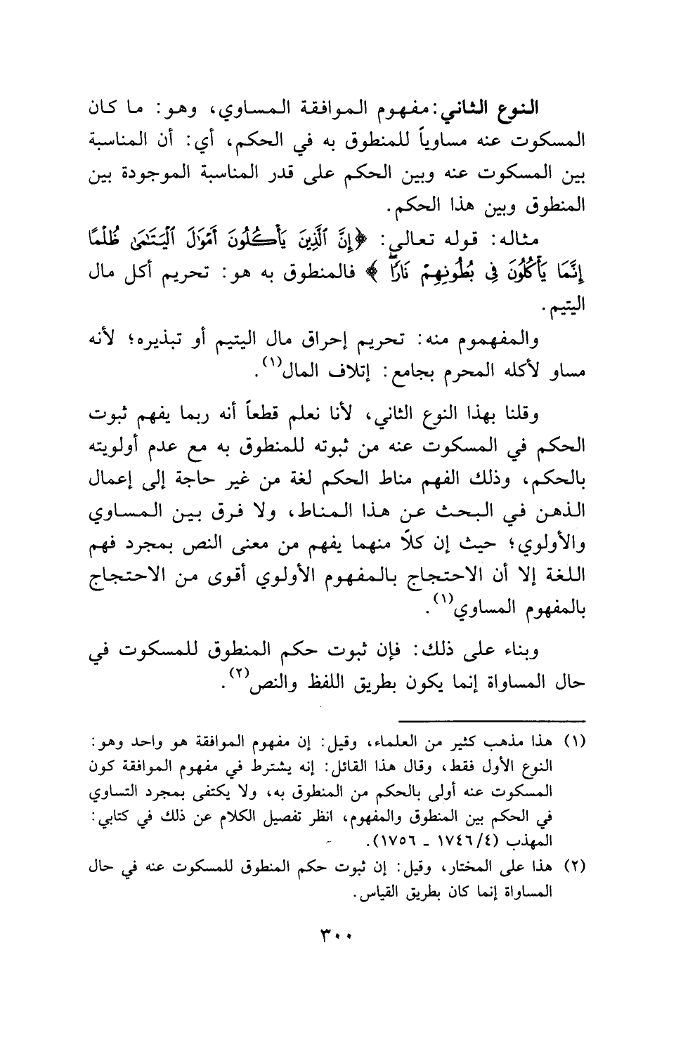 وقلنا بهذا النوع الثاني، لأنا نعلم قطعاً أنه ربما يفهم ثبوت الحكم في المسكوت عنه من ثبوته للمنطوق به مع عدم أولويته بالحكم، وذلك الفهم مناط الحكم لغة من غير حاجة إلى إعمال الذهن في البحث عن هذا المناط، ولا فرق بين المساوي والأولوي؛ حيث إن كلاً منهما يفهم من معنى النص بمجرد فهم اللغة إلا أن الاحتجاج بالمفهوم الأولوي أقوى من الاحتجاج بالمفهوم المساوي.