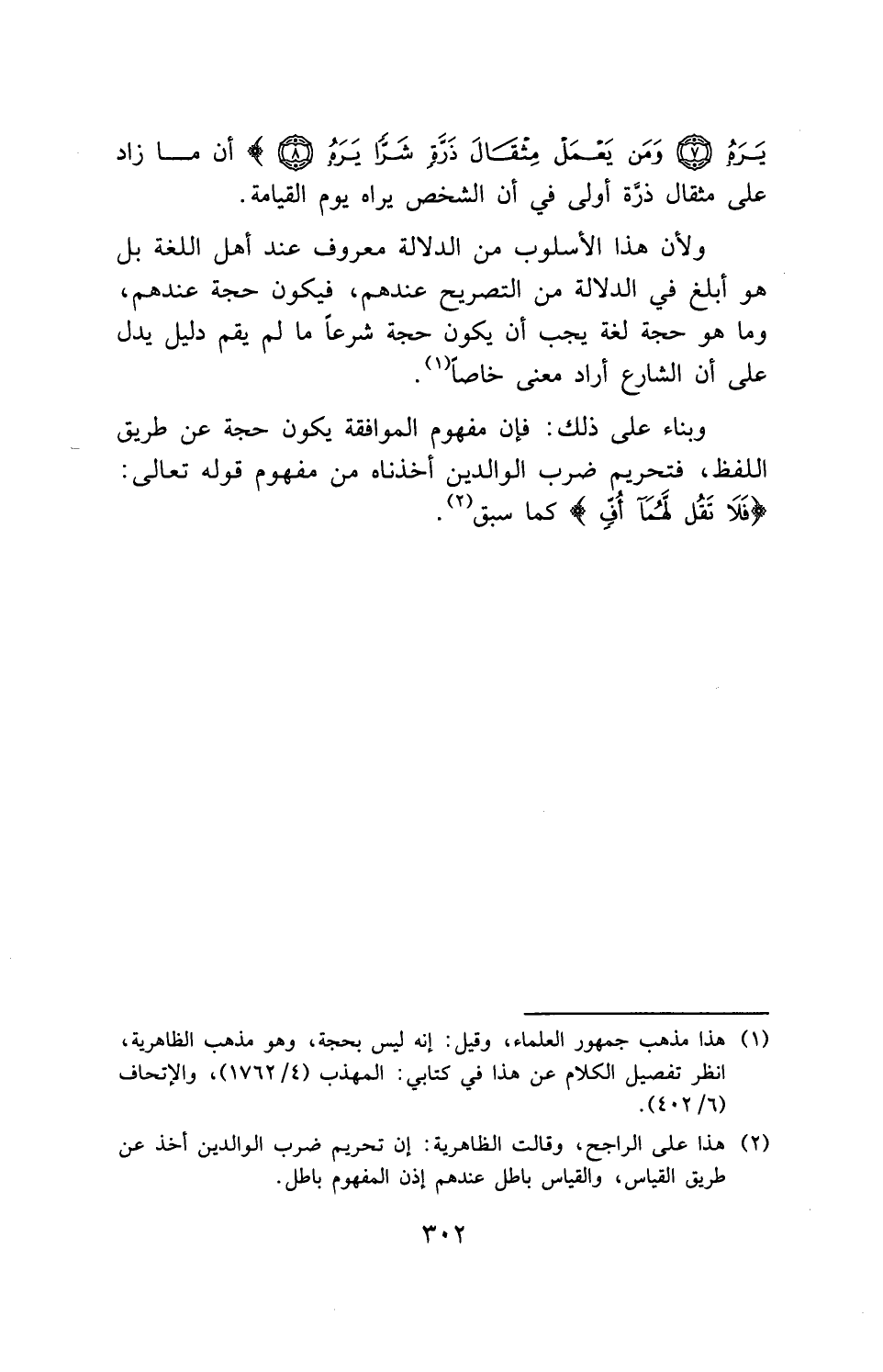 وبناء على ذلك: فإن مفهوم الموافقة يكون حجة عن طريق اللفظ، فتحريم ضرب الوالدين أخذناه من مفهوم قوله تعالى: (فَلَا تَقُلْ لَهُمَا أُفٍّ) كما سبق.