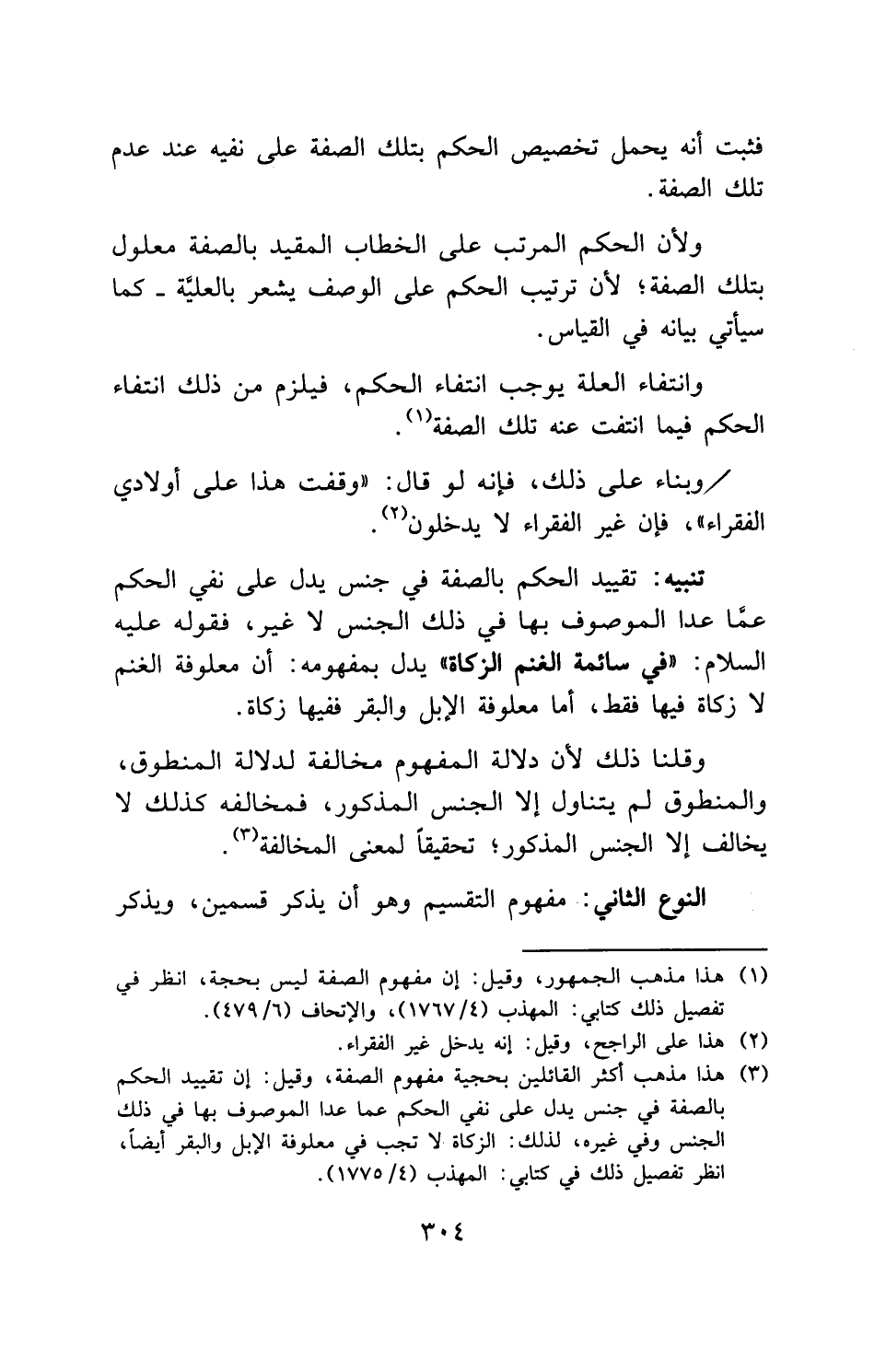 تنبيه: تقييد الحكم بالصفة في جنس يدل على نفي الحكم عما عدا الموصوف بها في ذلك الجنس لا غير، فقوله عليه السلام: " في سائمة الغنم الزكاة " يدل بمفهومه: أن معلوفة الغنم لا زكاة فيها فقط، أما معلوفة الإبل والبقر ففيها زكاة.