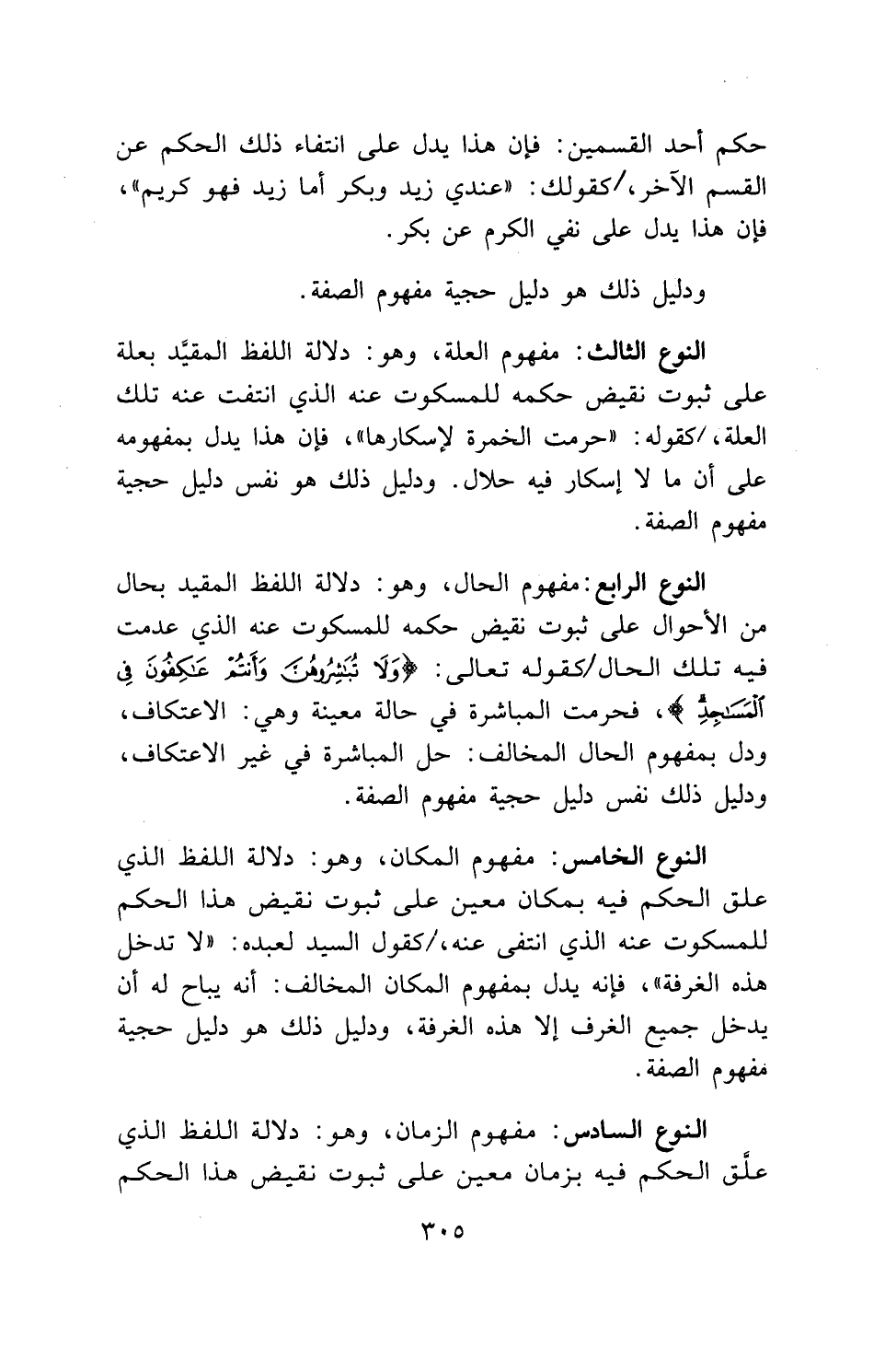 النوع الرابع: مفهوم الحال، وهو: دلالة اللفظ المقيد بحال من الأحوال على ثبوت نقيض حكمه للمسكوت عنه الذي عدمت فيه تلك الحال كقوله تعالى: (وَلَا تُبَاشِرُوهُنَّ وَأَنْتُمْ عَاكِفُونَ فِي الْمَسَاجِدِ)، فحرمت المباشرة في حالة معينة وهي: الاعتكاف، ودل بمفهوم الحال المخالف: حل المباشرة في غير الاعتكاف، ودليل ذلك نفس دليل حجية مفهوم الصفة.