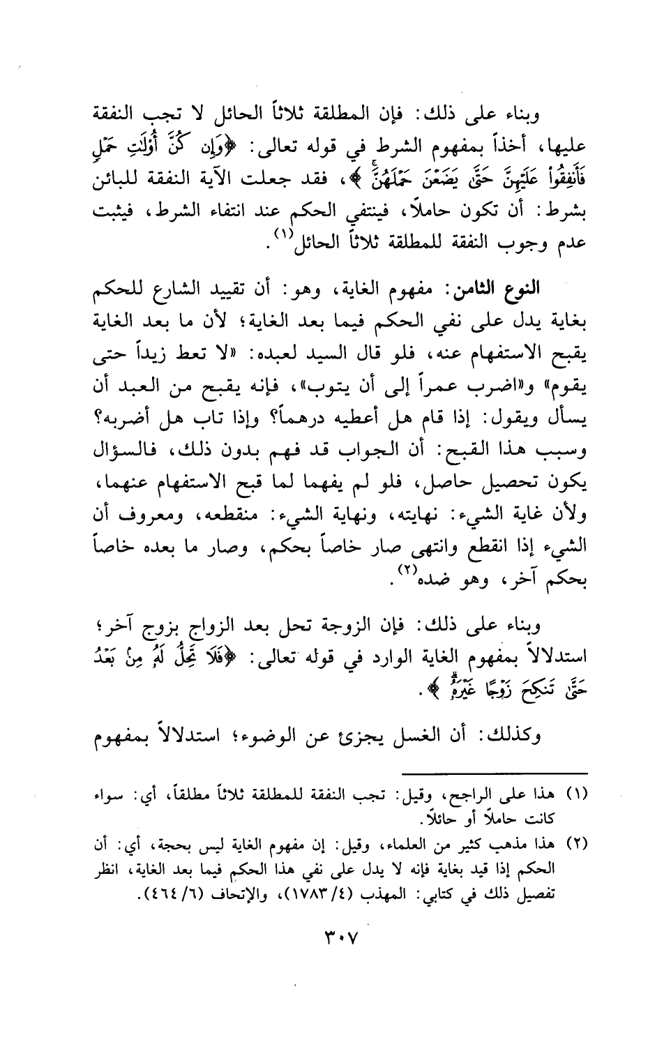 النوع الثامن: مفهوم الغاية، وهو: أن تقييد الشارع للحكم بغاية يدل على نفي الحكم فيما بعد الغاية؛ لأن ما بعد الغاية يقبح الاستفهام عنه، فلو قال السيد لعبده: " لا تعط زيداً حتى يقوم " و " اضرب عمراً إلى أن يتوب "، فإنه يقبح من العبد أن يسأل ويقول: إذا قام هل أعطيه درهماً؛ وإذا تاب هل أضربه؟ وسبب هذا القبح: أن الجواب قد فهم بدون ذلك، فالسؤال يكون تحصيل حاصل، فلو لم يفهما لما قبح الاستفهام عنهما، ولأن غاية الشيء: نهايته، ونهاية الشيء: منقطعه، ومعروف أن الشيء إذا انقطع وانتهى صار خاصاً بحكم، وصار ما بعده خاصاً بحكم آخر، وهو ضده.