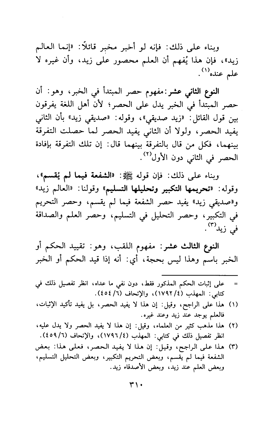 وبناء على ذلك: فإن قوله - صلى الله عليه وسلم -: " الشفعة فيما لم يُقسم "، وقوله: " تحريمها التكبير وتحليلها التسليم " وقولنا: " العالم زيد " و" صديقي زيد " يفيد حصر الشفعة فيما لم يقسم، وحصر التحريم في التكبير، وحصر التحليل في التسليم، وحصر العلم والصداقة في زيد.