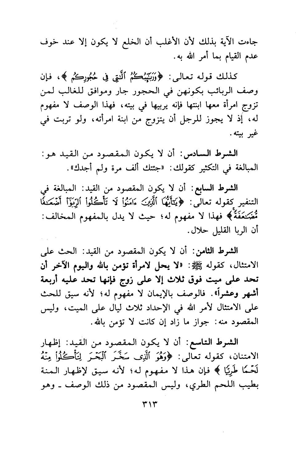 الشرط السابع: أن لا يكون المقصود من القيد: المبالغة في التنفير كقوله تعالى: (يَا أَيُّهَا الَّذِينَ آمَنُوا لَا تَأْكُلُوا الرِّبَا أَضْعَافًا مُضَاعَفَةً) فهذا لا مفهوم له؛ حيث لا يدل بالمفهوم المخالف: أن الربا القليل حلال.