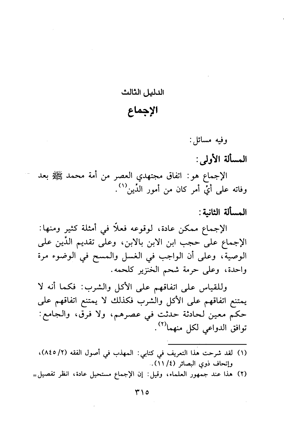 الإجماع ممكن عادة، لوقوعه فعلاً في أمثلة كثير ومنها: الإجماع على حجب ابن الابن بالابن، وعلى تقديم الدَّين على الوصية، وعلى أن الواجب في الغسل والمسح في الوضوء مرة واحدة، وعلى حرمة شحم الخنزير كلحمه.