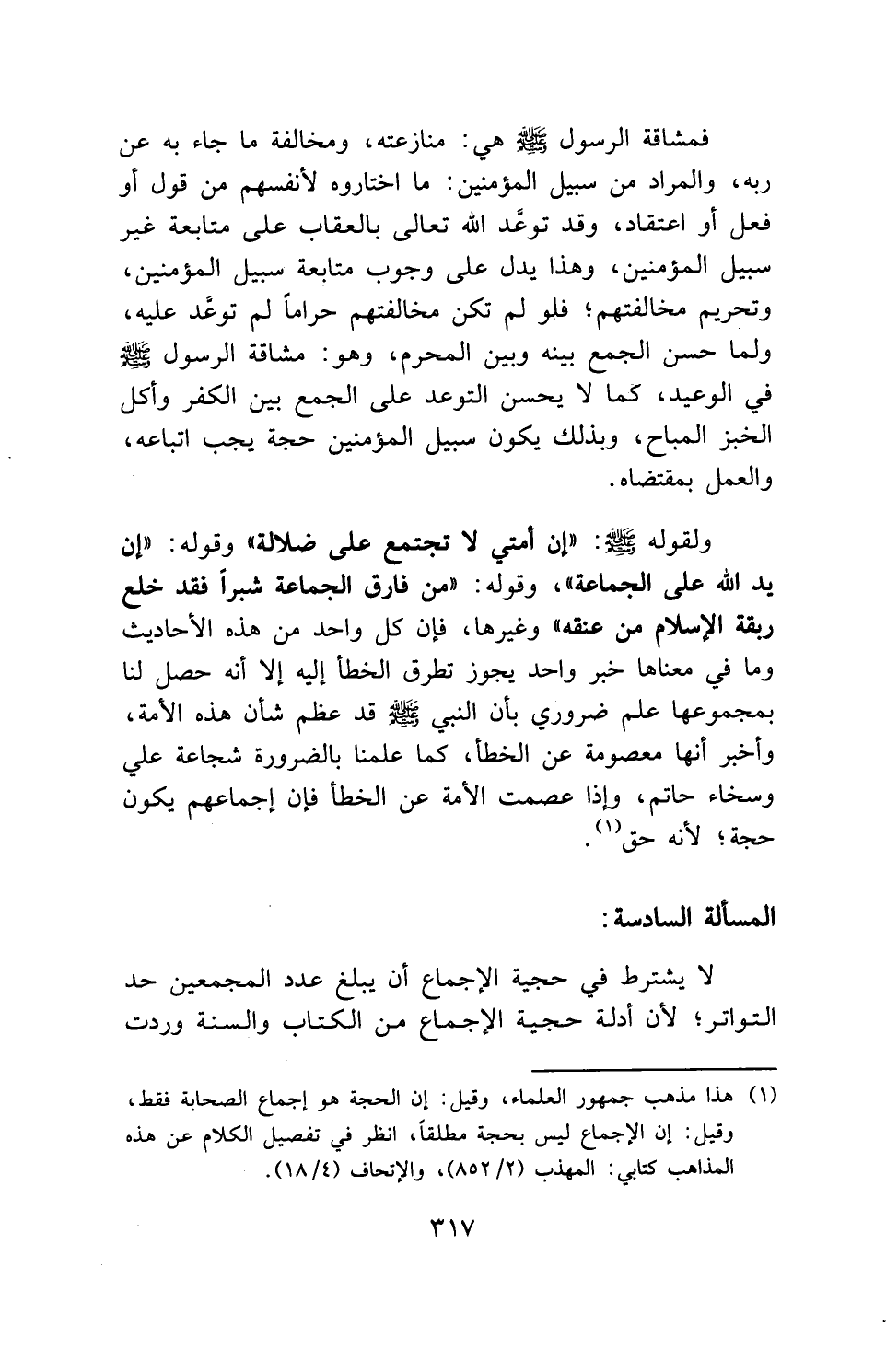 ولقوله - صلى الله عليه وسلم -: " إن أمتي لا تجتمع على ضلالة " وقوله: " إن يد الله على الجماعة "، وقوله: " من فارق الجماعة شبراً فقد خلع ربقة الإسلام من عنقه " وغيرها، فإن كل واحد من هذه الأحاديث وما في معناها خبر واحد يجوز تطرق الخطأ إليه إلا أنه حصل لنا بمجموعها علم ضروري بأن النبي - صلى الله عليه وسلم - قد عظم شأن هذه الأمة، وأخبر أنها معصومة عن الخطأ، كما علمنا بالضرورة شجاعة علي وسخاء حاتم، وإذا عصمت الأمة عن الخطأ فإن إجماعهم يكون حجة؛ لأنه حق.