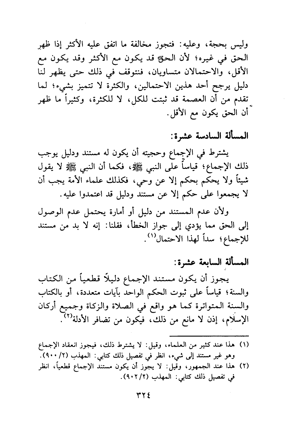 وليس بحجة، وعليه: فتجوز مخالفة ما اتفق عليه الأكثر إذا ظهر الحق في غيره؛ لأن الحق قد يكون مع الأكثر وقد يكون مع الأقل، والاحتمالان متساويان، فنتوقف في ذلك حتى يظهر لنا دليل يرجح أحد هذين الاحتمالين، والكثرة لا تتميز بشيء؛ لما تقدم من أن العصمة قد ثبتت للكل، لا للكثرة، وكثيراً ما ظهر أن الحق يكون مع الأقل.