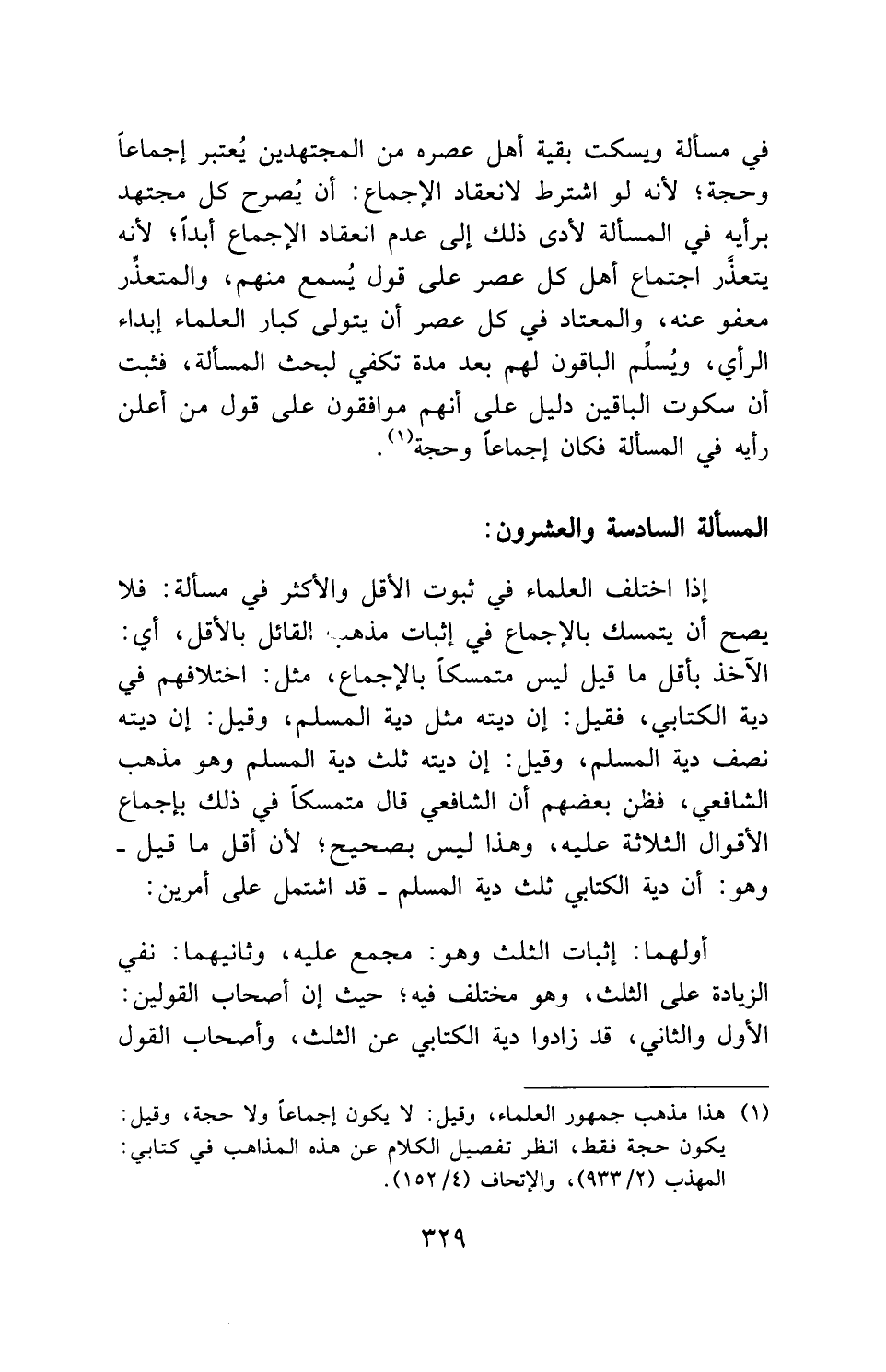 في مسألة ويسكت بقية أهل عصره من المجتهدين يُعتبر إجماعاً وحجة؛ لأنه لو اشترط لانعقاد الإجماع: أن يُصرح كل مجتهد برأيه في المسألة لأدى ذلك إلى عدم انعقاد الإجماع أبداً؛ لأنه يتعذَّر اجتماع أهل كل عصر على قول يُسمع منهم، والمتعذر معفو عنه، والمعتاد في كل عصر أن يتولى كبار العلماء إبداء الرأي، ويُسلِّم الباقون لهم بعد مدة تكفي لبحث المسألة، فثبت أن سكوت الباقين دليل على أنهم موافقون على قول من أعلن رأيه في المسألة فكان إجماعاً وحجة.