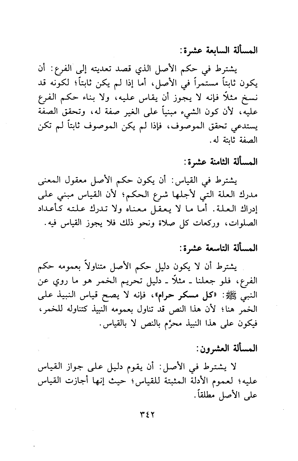 يشترط أن لا يكون دليل حكم الأصل متناولاً بعمومه حكم الفرع، فلو جعلنا - مثلاً - دليل تحريم الخمر هو ما روي عن النبي - صلى الله عليه وسلم -: " كل مسكر حرام "، فإنه لا يصح قياس النبيذ على الخمر هنا؛ لأن هذا النص قد تناول بعمومه النبيذ كتناوله للخمر، فيكون على هذا النبيذ محرَّم بالنص لا بالقياس.