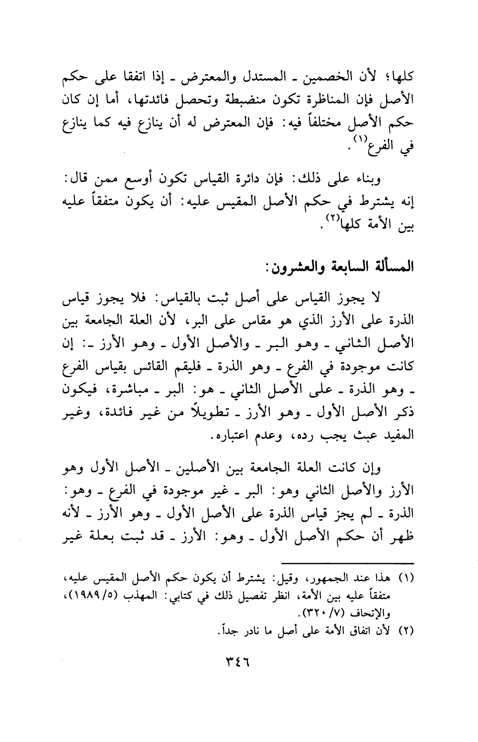 لا يجوز القياس على أصل ثبت بالقياس: فلا يجوز قياس الذرة على الأرز الذي هو مقاس على البر، لأن العلة الجامعة بين الأصل الثاني - وهو البر - والأصل الأول - وهو الأرز -: إن كانت موجودة في الفرع - وهو الذرة - فليقم القائس بقياس الفرع - وهو الذرة - على الأصل الثاني - هو: البر - مباشرة، فيكون ذكر الأصل الأول - وهو الأرز - تطويلاً من غير فائدة، وغير المفيد عبث يجب رده، وعدم اعتباره.