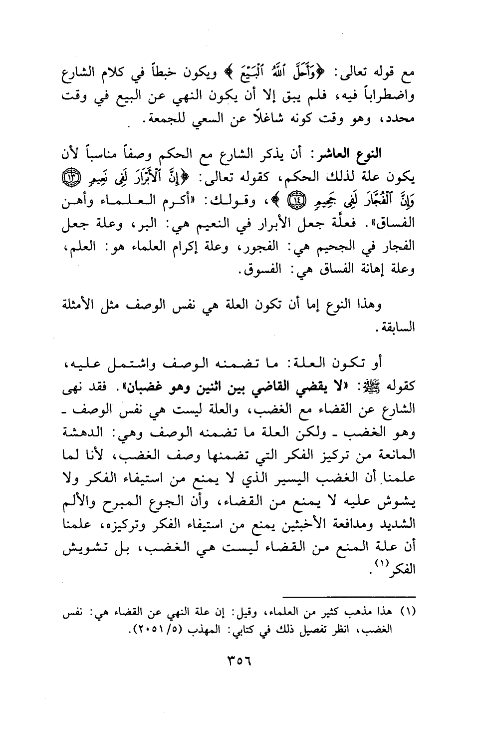 أو تكون العلة: ما تضمنه الوصف واشتمل عليه، كقوله - صلى الله عليه وسلم -: " لا يقضي القاضي بين اثنين وهو غضبان ". فقد نهى الشارع عن القضاء مع الغضب، والعلة ليست هي نفس الوصف - وهو الغضب - ولكن العلة ما تضمنه الوصف وهي: الدهشة المانعة من تركيز الفكر التي تضمنها وصف الغضب، لأنا لما علمنا. أن الغضب اليسير الذي لا يمنع من استيفاء الفكر ولا يشوش عليه لا يمنع من القضاء، وأن الجوع المبرح والألم الشديد ومدافعة الأخبثين يمنع من استيفاء الفكر وتركيزه، علمنا أن علة المنع من القضاء ليست هي الغضب، بل تشويش الفكر.