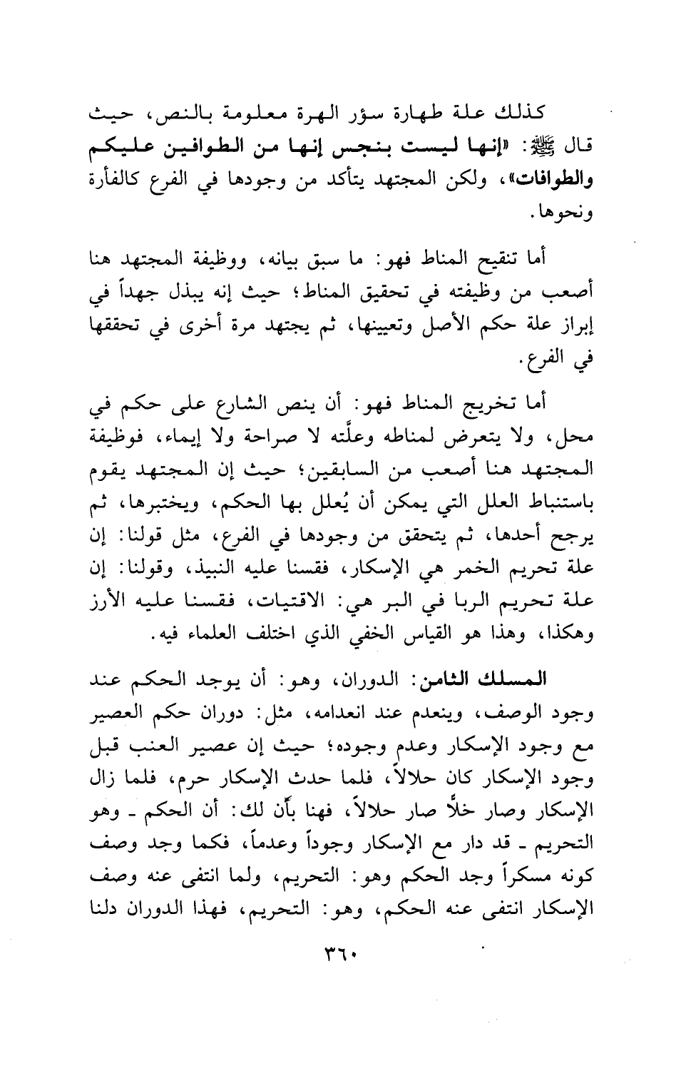 كذلك علة طهارة سؤر الهرة معلومة بالنص، حيث قال - صلى الله عليه وسلم -: " إنها ليست بنجس إنها من الطوافين عليكم والطوافات "، ولكن المجتهد يتأكد من وجودها في الفرع كالفأرة ونحوها.