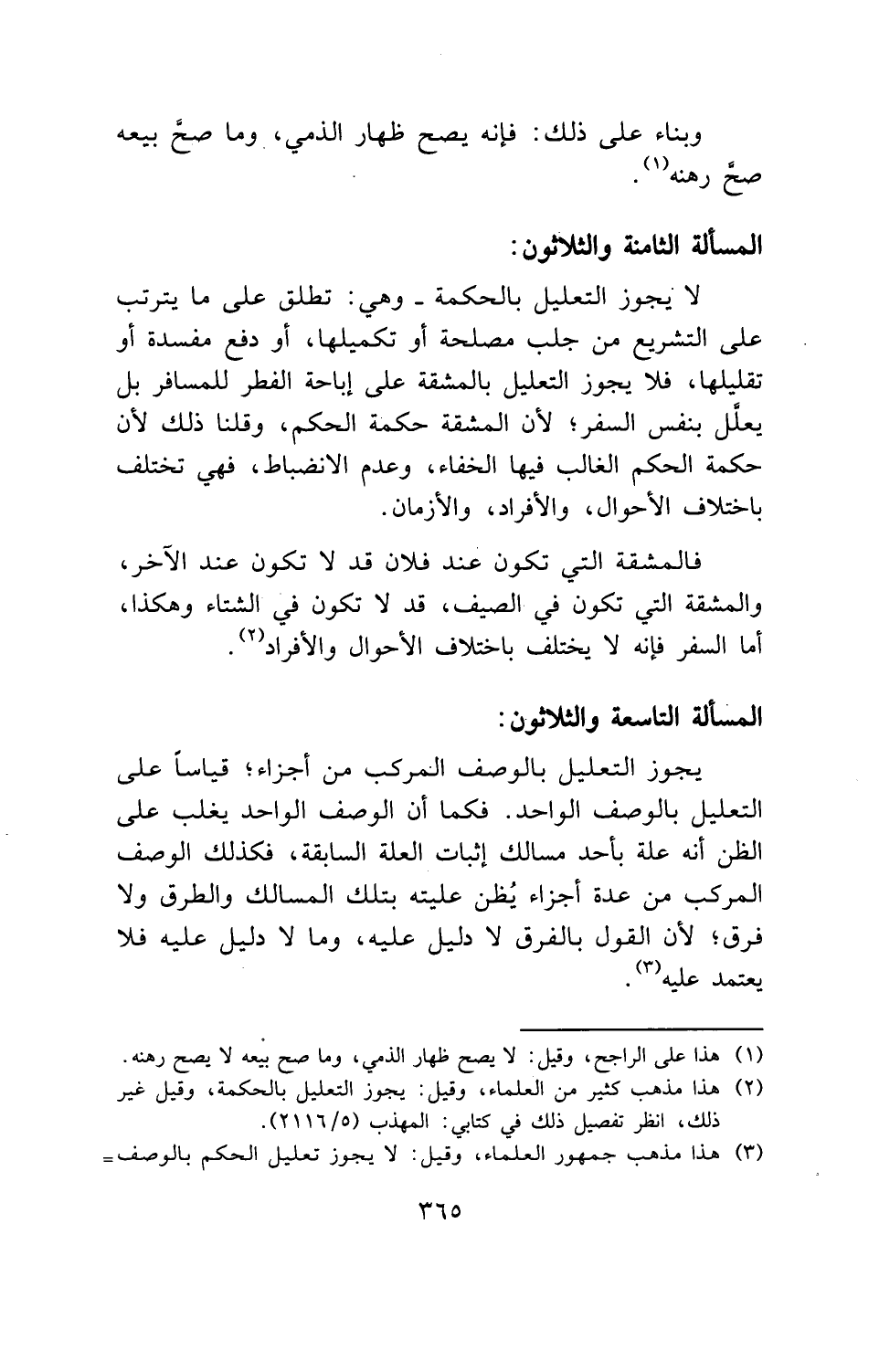 لا يجوز التعليل بالحكمة - وهي: تطلق على ما يترتب على التشريع من جلب مصلحة أو تكميلها، أو دفع مفسدة أو تقليلها، فلا يجوز التعليل بالمشقة على إباحة الفطر للمسافر بل يعلل بنفس السفر؛ لأن المشقة حكمة الحكم، وقلنا ذلك لأن حكمة الحكم الغالب فيها الخفاء، وعدم الانضباط، فهي تختلف باختلاف الأحوال، والأفراد، والأزمان.