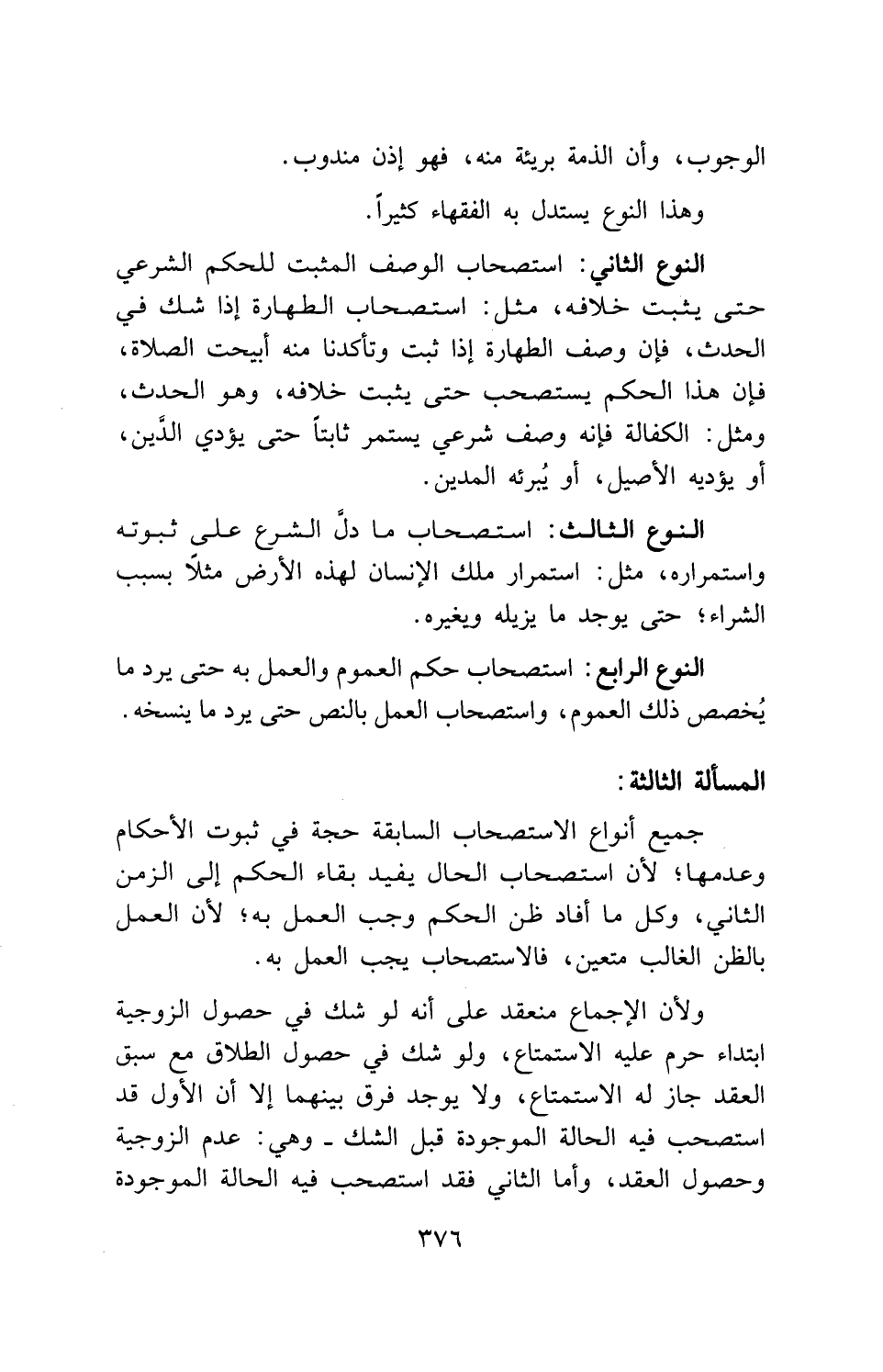 النوع الثالث: استصحاب ما دلَّ الشرع على ثبوته واستمراره، مثل: استمرار ملك الإنسان لهذه الأرض مثلاً بسبب الشراء؛ حتى يوجد ما يزيله ويغيره.