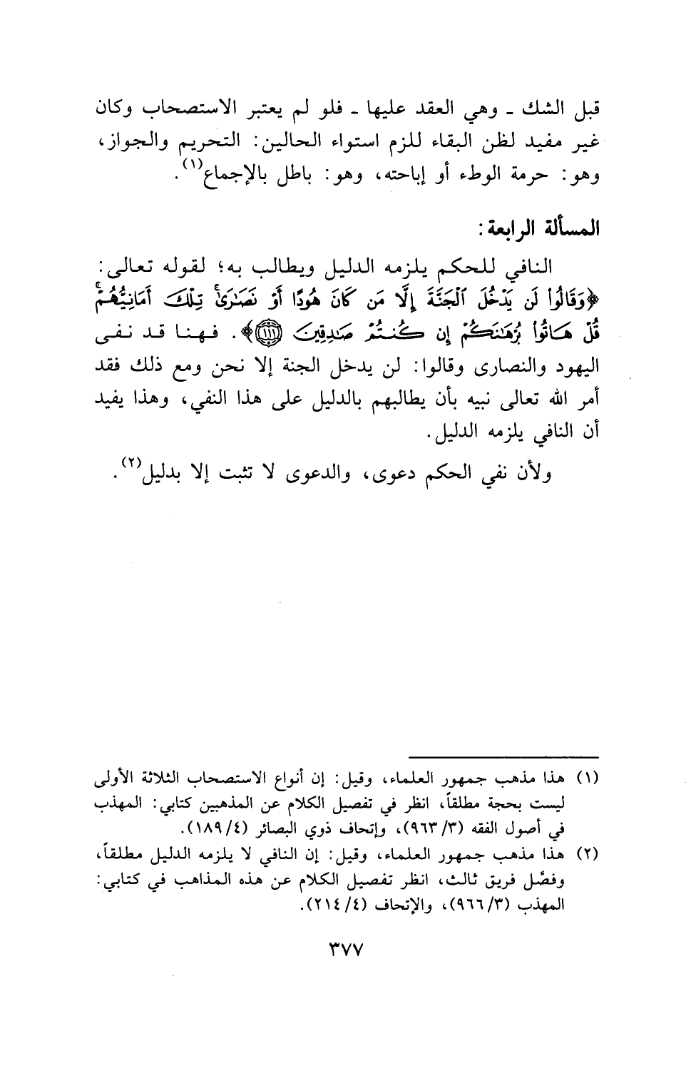 النافي للحكم يلزمه الدليل ويطالب به؛ لقوله تعالى: (وَقَالُوا لَنْ يَدْخُلَ الْجَنَّةَ إِلَّا مَنْ كَانَ هُودًا أَوْ نَصَارَى تِلْكَ أَمَانِيُّهُمْ قُلْ هَاتُوا بُرْهَانَكُمْ إِنْ كُنْتُمْ صَادِقِينَ (111)).