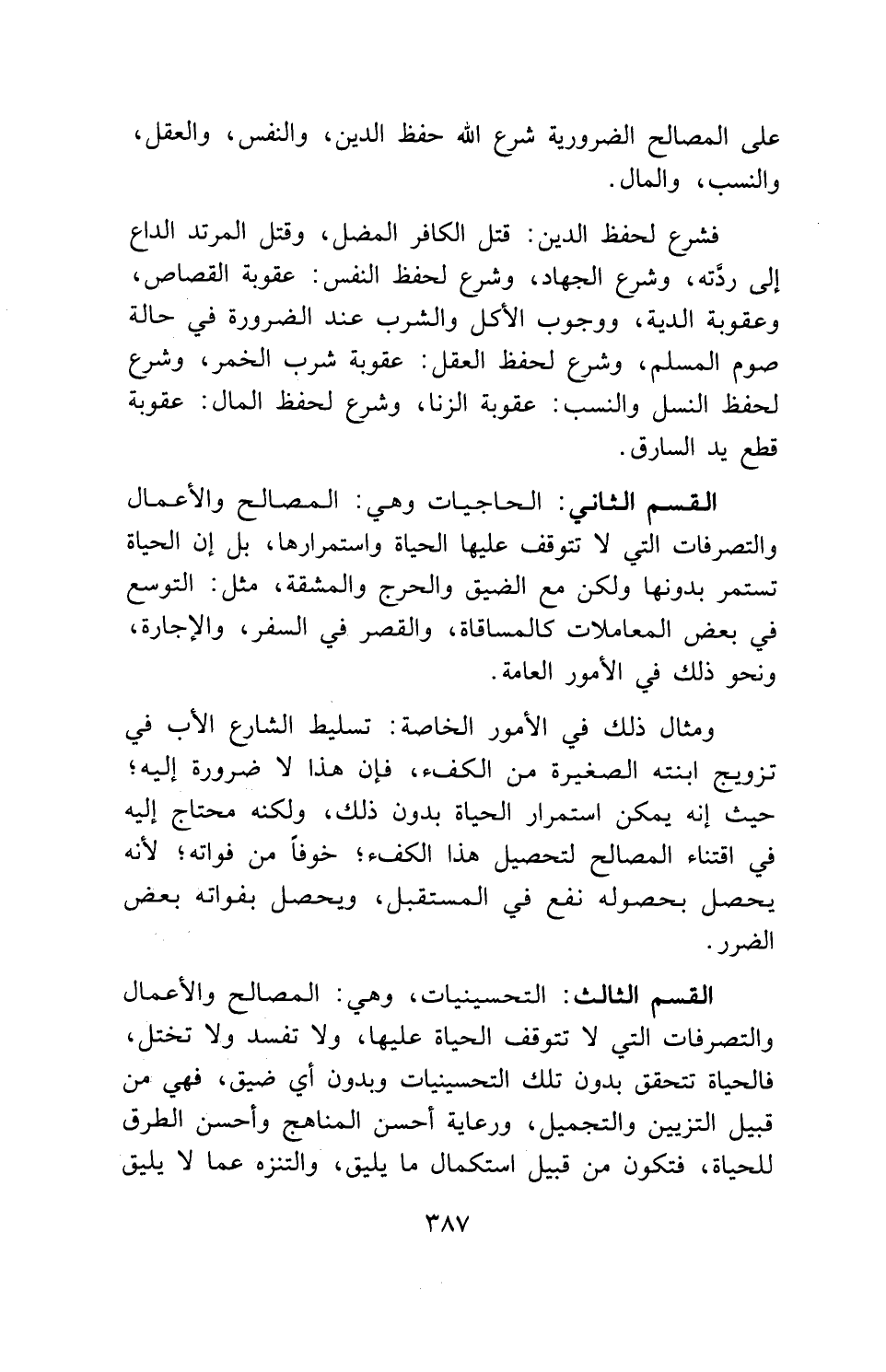 القسم الثالث: التحسينيات، وهي: المصالح والأعمال والتصرفات التي لا تتوقف الحياة عليها، ولا تفسد ولا تختل، فالحياة تتحقق بدون تلك التحسينيات وبدون أي ضيق، فهي من قبيل التزيين والتجميل، ورعاية أحسن المناهج وأحسن الطرق للحياة، فتكون من قبيل استكمال ما يليق، والتنزه عما لا يليق