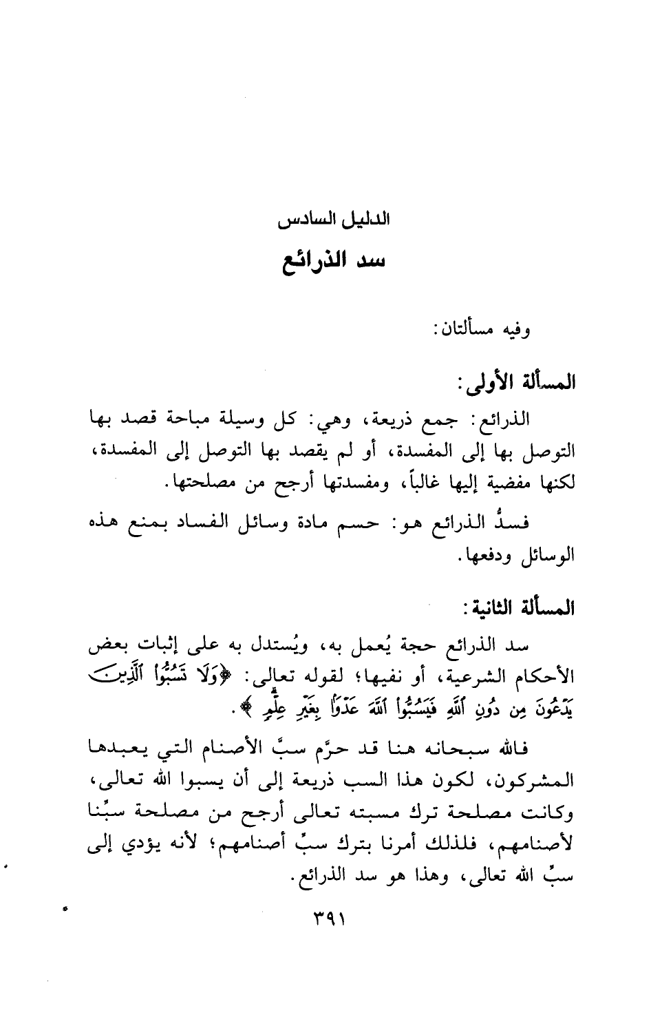فالله سبحانه هنا قد حرَّم سبَّ الأصنام التي يعبدها المشركون، لكون هذا السب ذريعة إلى أن يسبوا الله تعالى، وكانت مصلحة ترك مسبته تعالى أرجح من مصلحة سبِّنا لأصنامهم، فلذلك أمرنا بترك سبِّ أصنامهم؛ لأنه يؤدي إلى سبًّا الله تعالى، وهذا هو سد الذرائع.