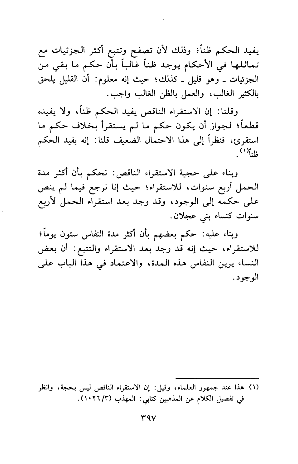 وبناء على حجية الاستقراء الناقص: نحكم بأن أكثر مدة الحمل أربع سنوات، للاستقراء؛ حيث إنا نرجع فيما لم ينص على حكمه إلى الوجود، وقد وجد بعد استقراء الحمل لأربع سنوات كنساء بني عجلان.