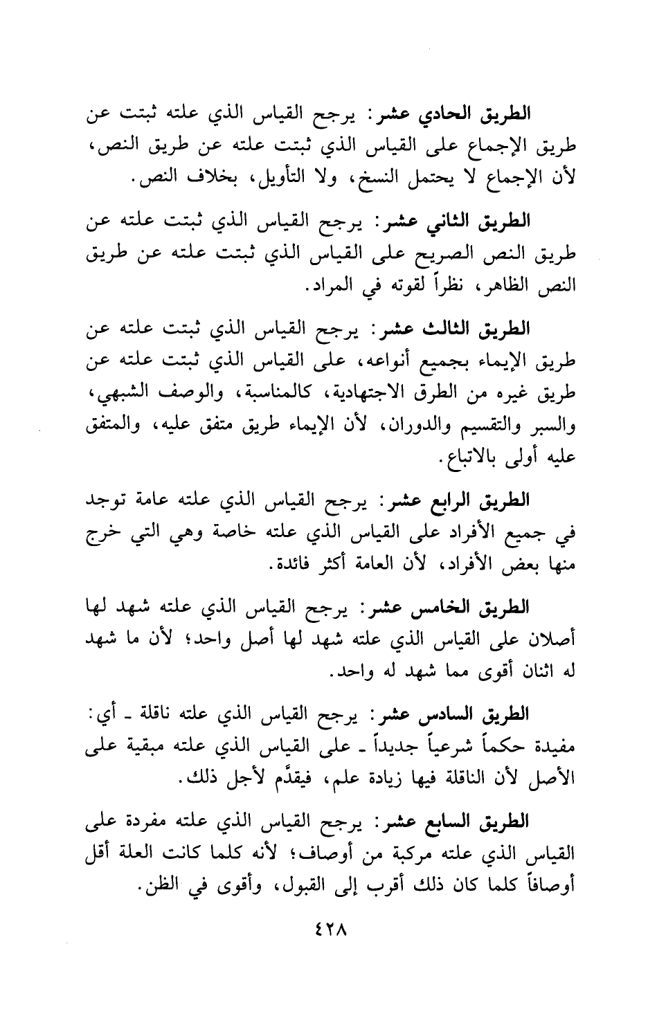 الطريق الرابع عشر: يرجح القياس الذي علته عامة توجد في جميع الأفراد على القياس الذي علته خاصة وهي التي خرج منها بعض الأفراد، لأن العامة أكثر فائدة.