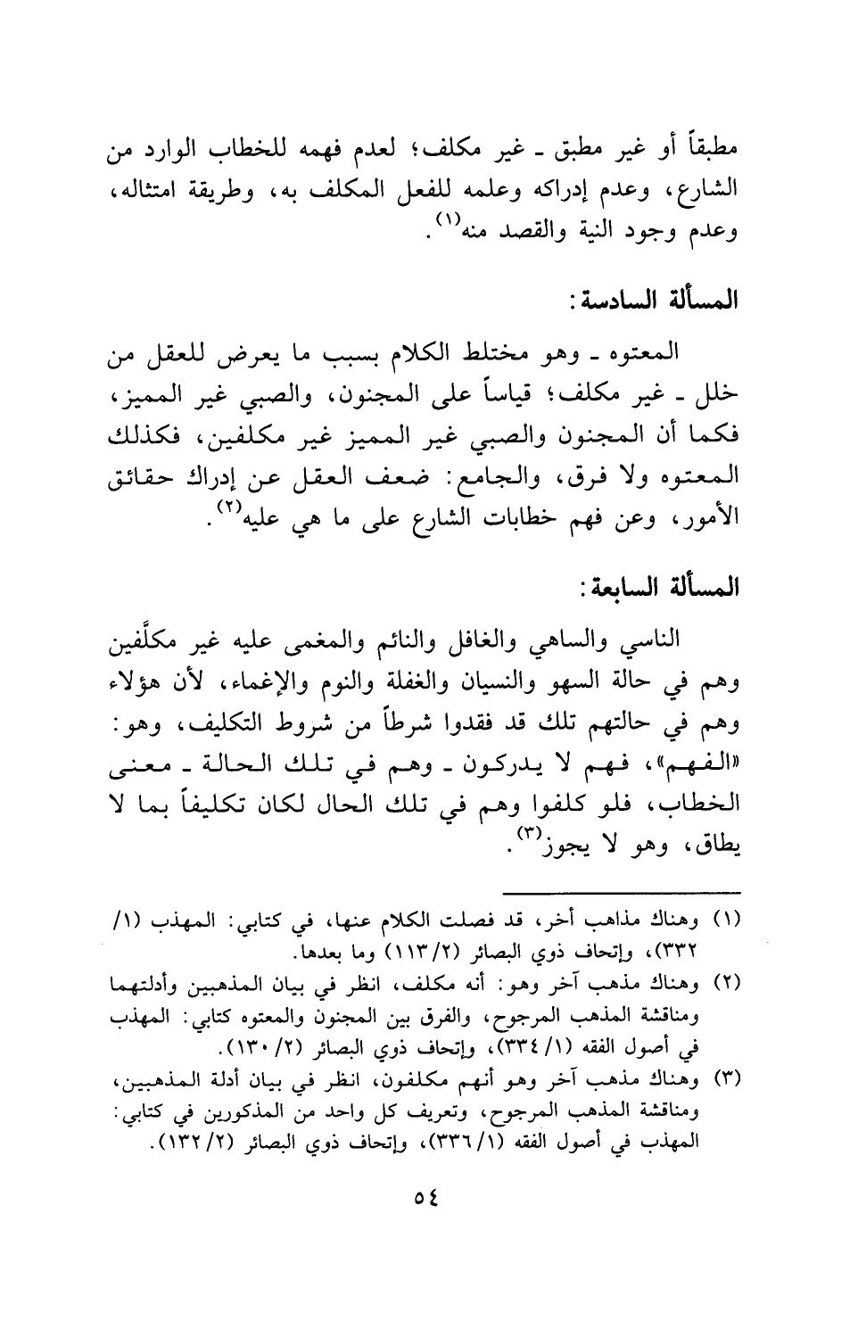 الناسي والساهي والغافل والنائم والمغمى عليه غير مكلفين وهم في حالة السهو والنسيان والغفلة والنوم والإغماء، لأن هؤلاء وهم في حالتهم تلك قد فقدوا شرطاً من شروط التكليف، وهو: " الفهم "، فهم لا يدركون - وهم في تلك الحالة - معنى الخطاب، فلو كلفوا وهم في تلك الحال لكان تكليفاً بما لا يطاق، وهو لا يجوز.