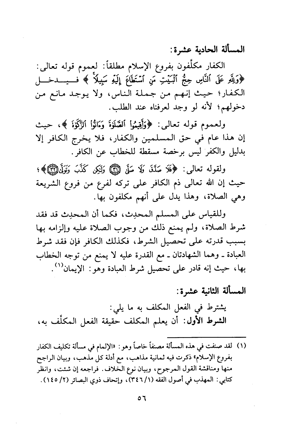 الكفار مكلَّفون بفروع الإسلام مطلقاً: لعموم قوله تعالى: (وَلِلَّهِ عَلَى النَّاسِ حِجُّ الْبَيْتِ مَنِ اسْتَطَاعَ إِلَيْهِ سَبِيلًا) فيدخل الكفار؛ حيث إنهم من جملة الناس، ولا يوجد مانع من دخولهم؛ لأنه لو وجد لعرفناه عند الطلب.
