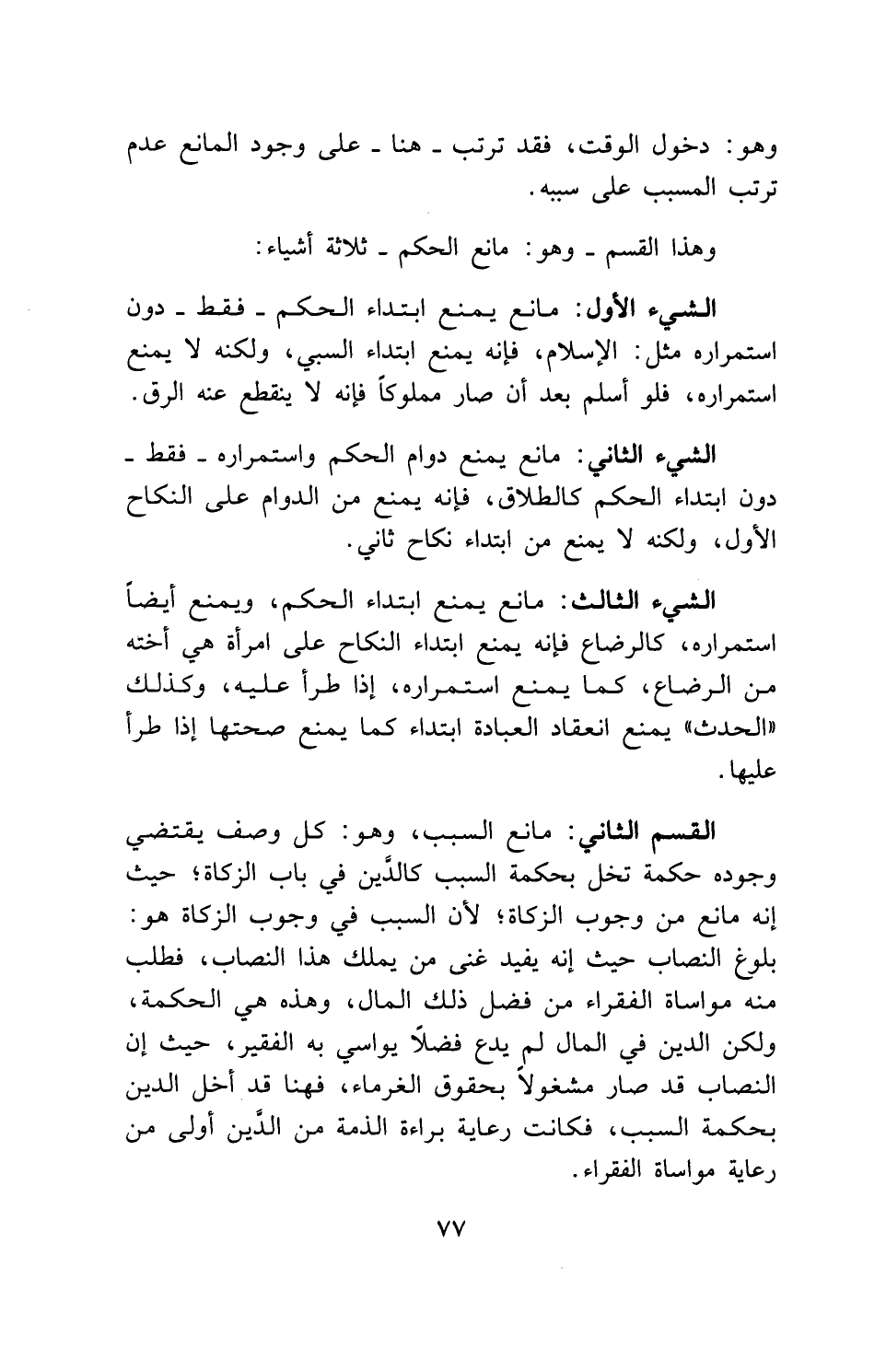 القسم الثاني: مانع السبب، وهو: كل وصف يقتضي وجوده حكمة تخل بحكمة السبب كالدَّين في باب الزكاة؛ حيث إنه مانع من وجوب الزكاة؛ لأن السبب في وجوب الزكاة هو: بلوغ النصاب حيث إنه يفيد غنى من يملك هذا النصاب، فطلب منه مواساة الفقراء من فضل ذلك المال، وهذه هي الحكمة، ولكن الدَّين في المال لم يدع فضلاً يواسي به الفقير، حيث إن النصاب قد صار مشغولاً بحقوق الغرماء، فهنا قد أخل الدَّين بحكمة السبب، فكانت رعاية براءة الذمة من الذين أولى من رعاية مواساة الفقراء.